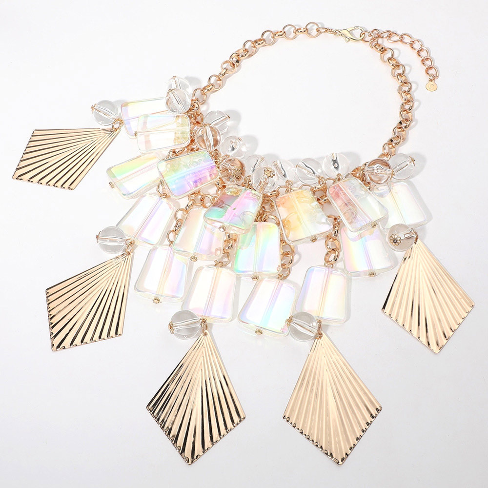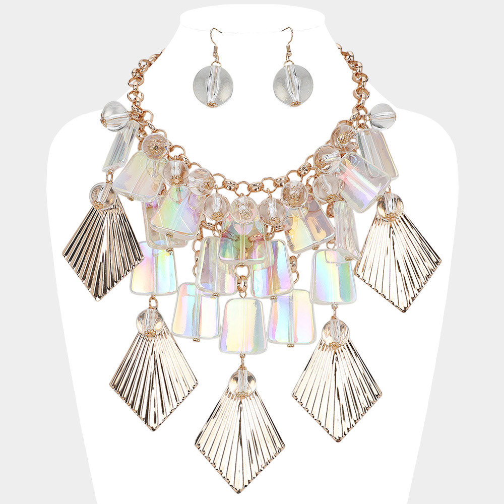 Textured Metal Acrylic Plate Ball Beaded Chandelier Statement Necklace