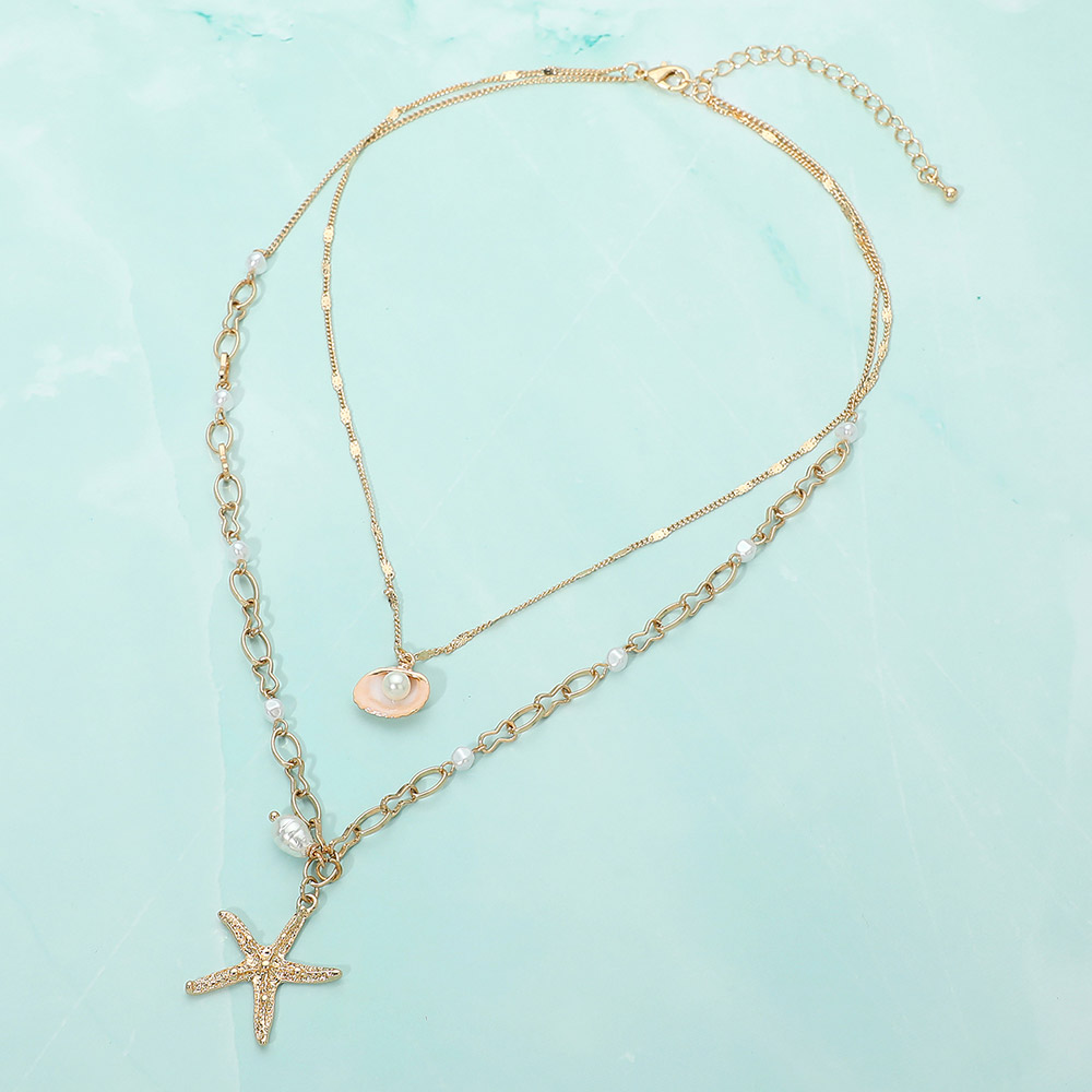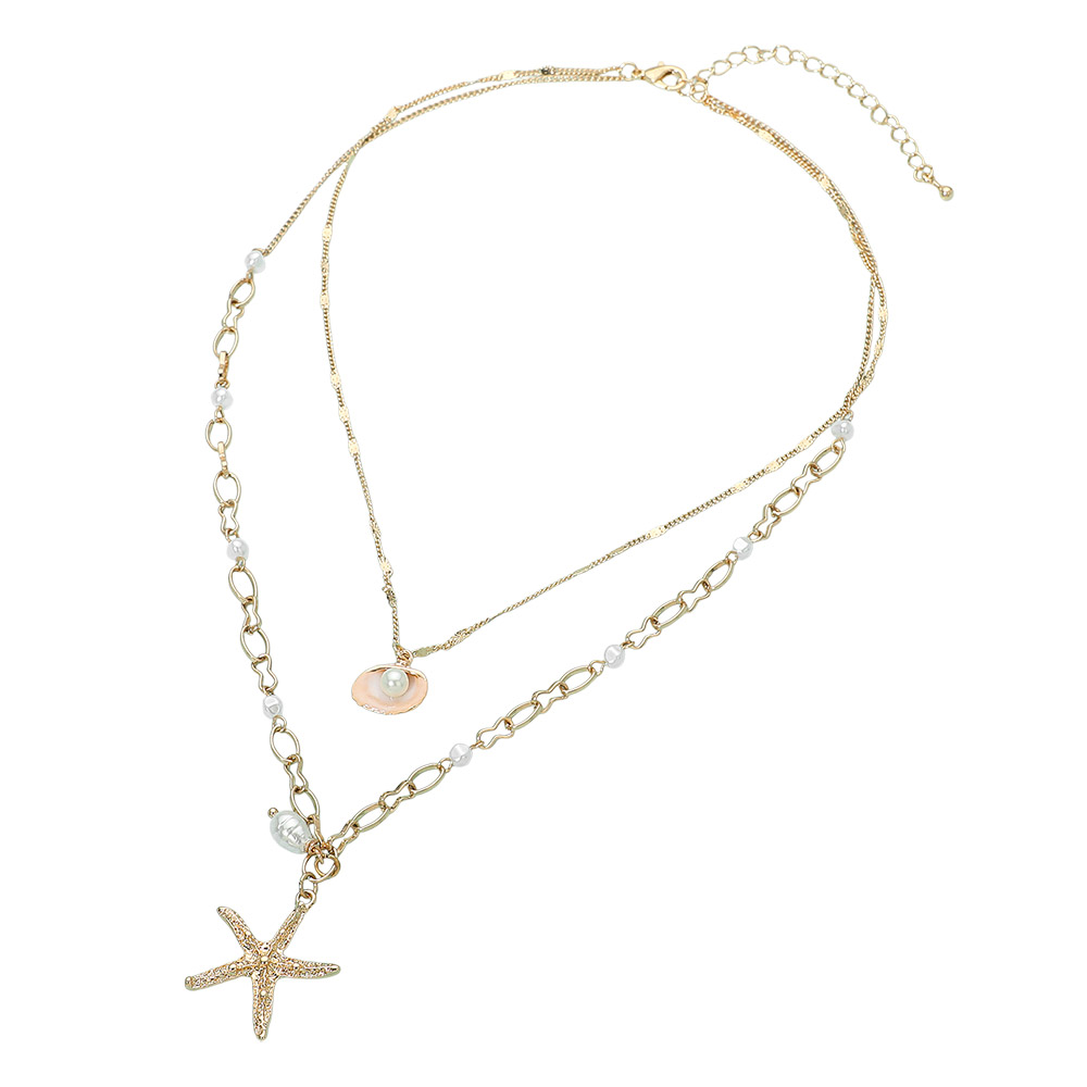 Details • Necklace Size : 16" + 3" L • Decor Size : 3.5" L • Pendant Size : 1" X 1" • Layered pendant necklace featuring a starfish charm and delicate beaded accents. Designed to create an effortless stacked look, this piece adds coastal-inspired style to everyday outfits, resort wear, and seasonal collections. Ideal for boutiques seeking versatile statement jewelry with a beach-themed touch. • Lead and Nickel Compliant
