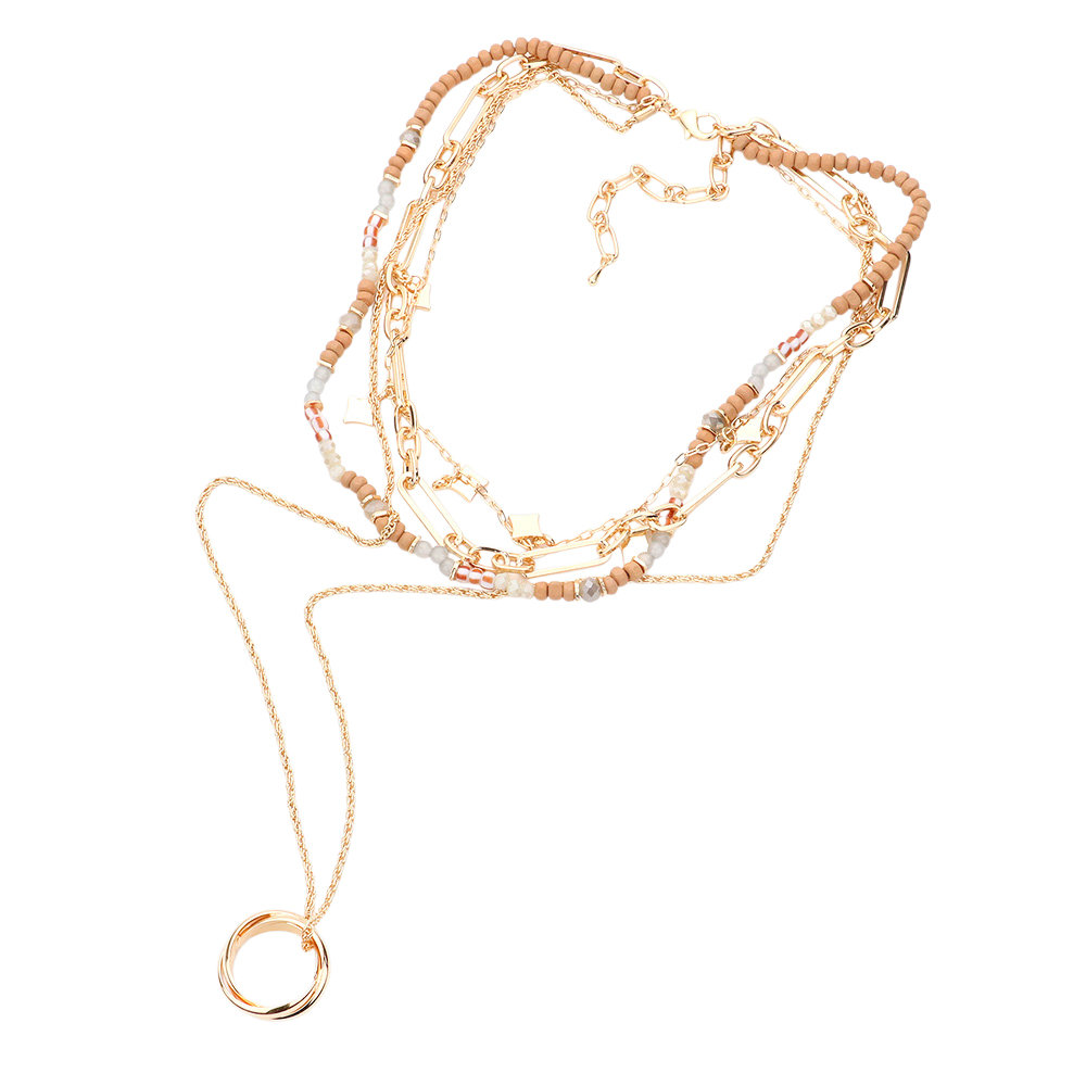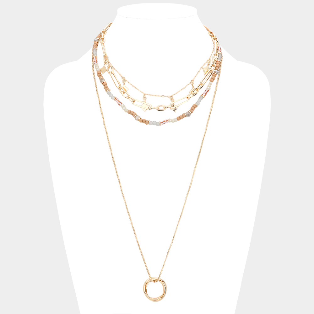 Triple Ring Pendant Wood Beaded Multi Layered Necklace