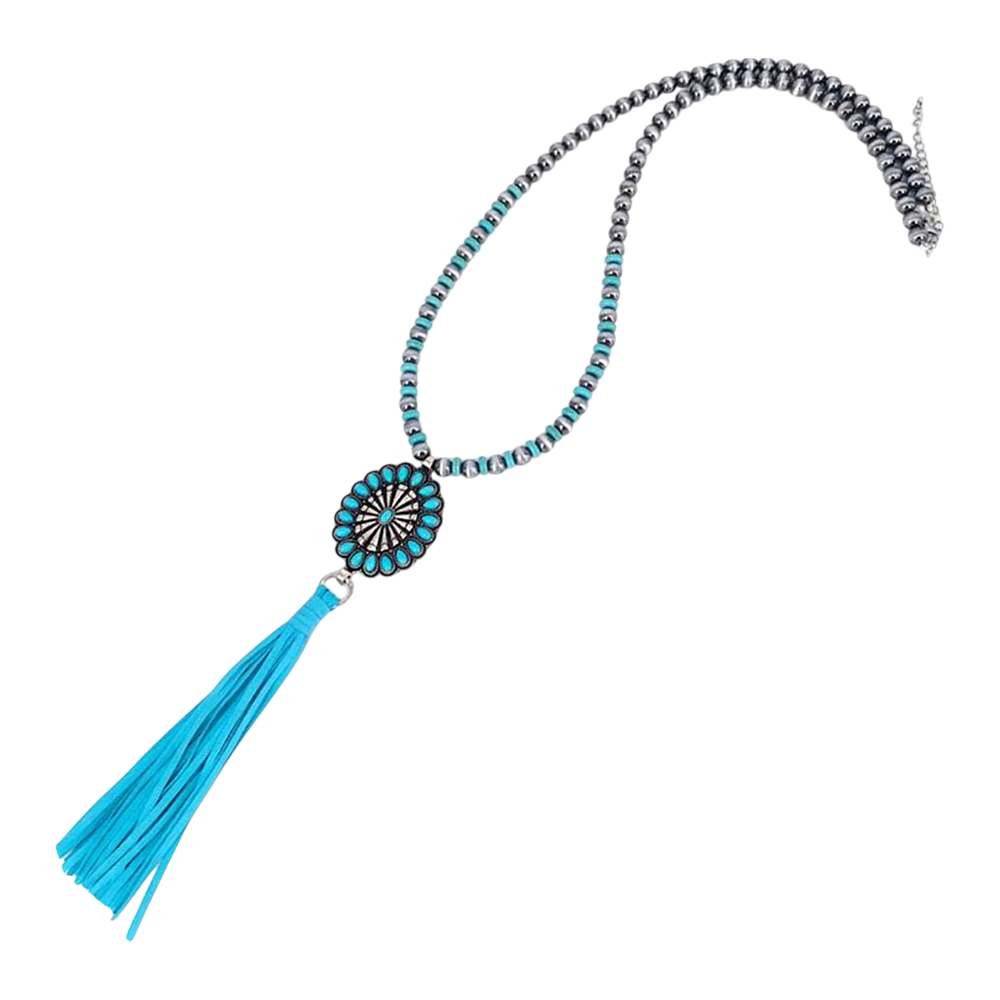 Turquoise Accented Antique Metal Squash Blossom Suede Tassel Link Long Necklace