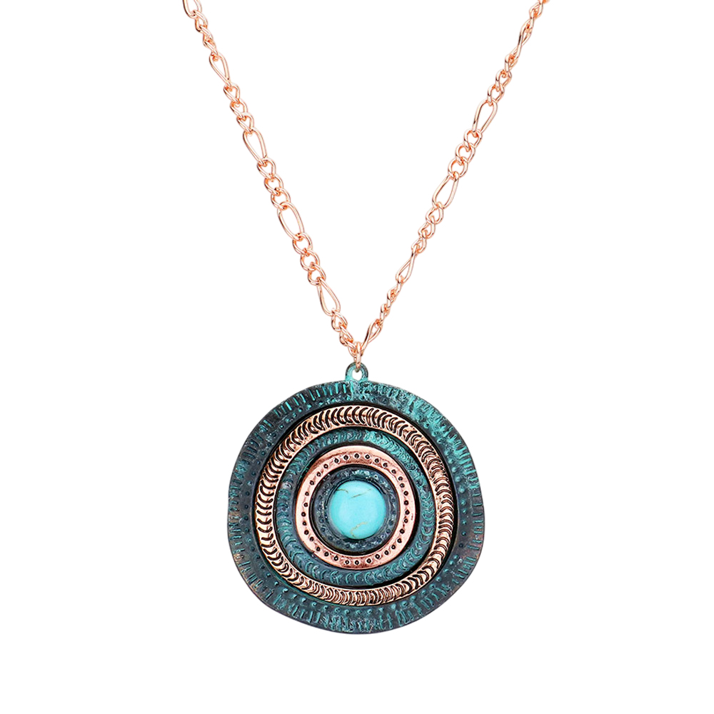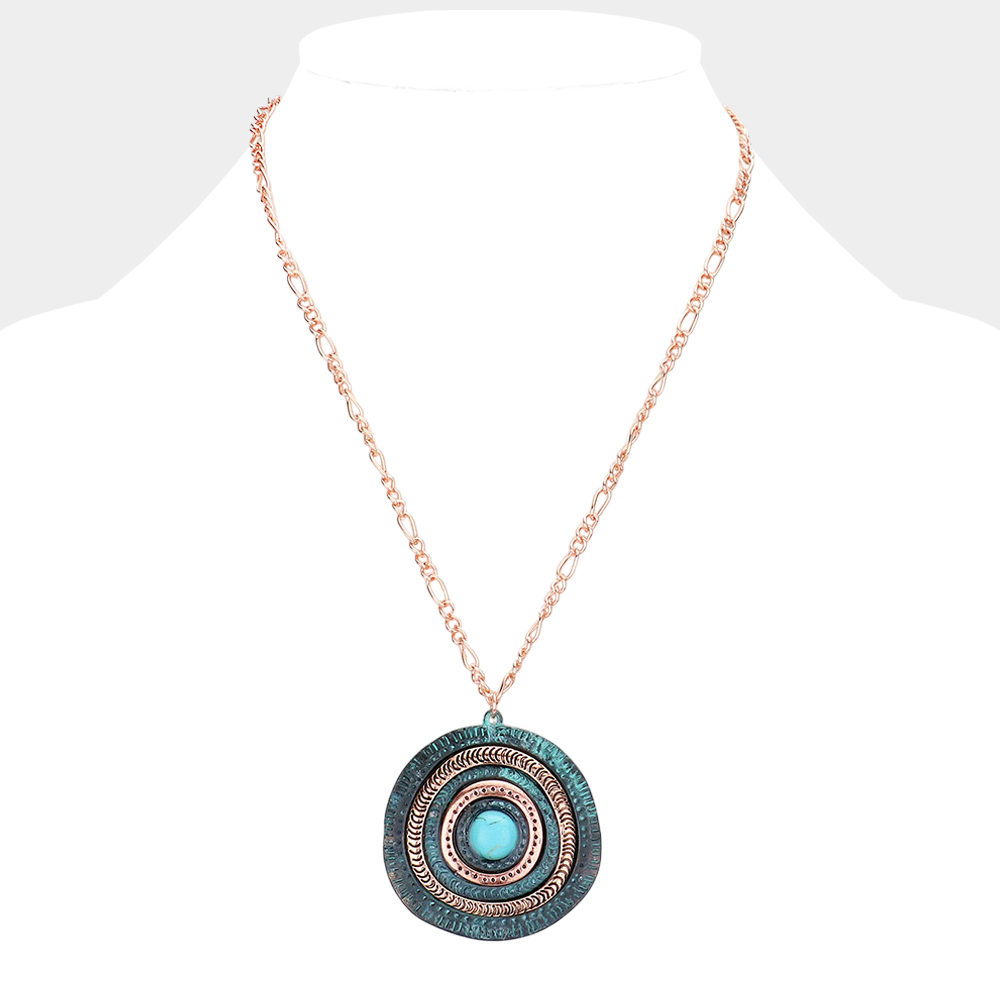 Turquoise Centered Irregular Metal Round Pendant Necklace