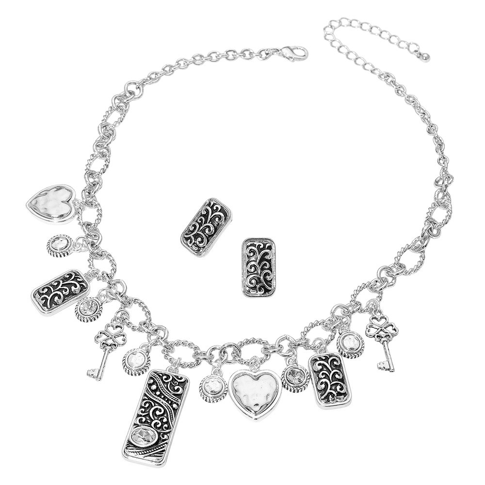 • Intricately designed necklace and earring set featuring ornate charms, including hearts, keys, and decorative panels. A timeless accessory that adds elegance and sophistication to both casual and formal outfits.