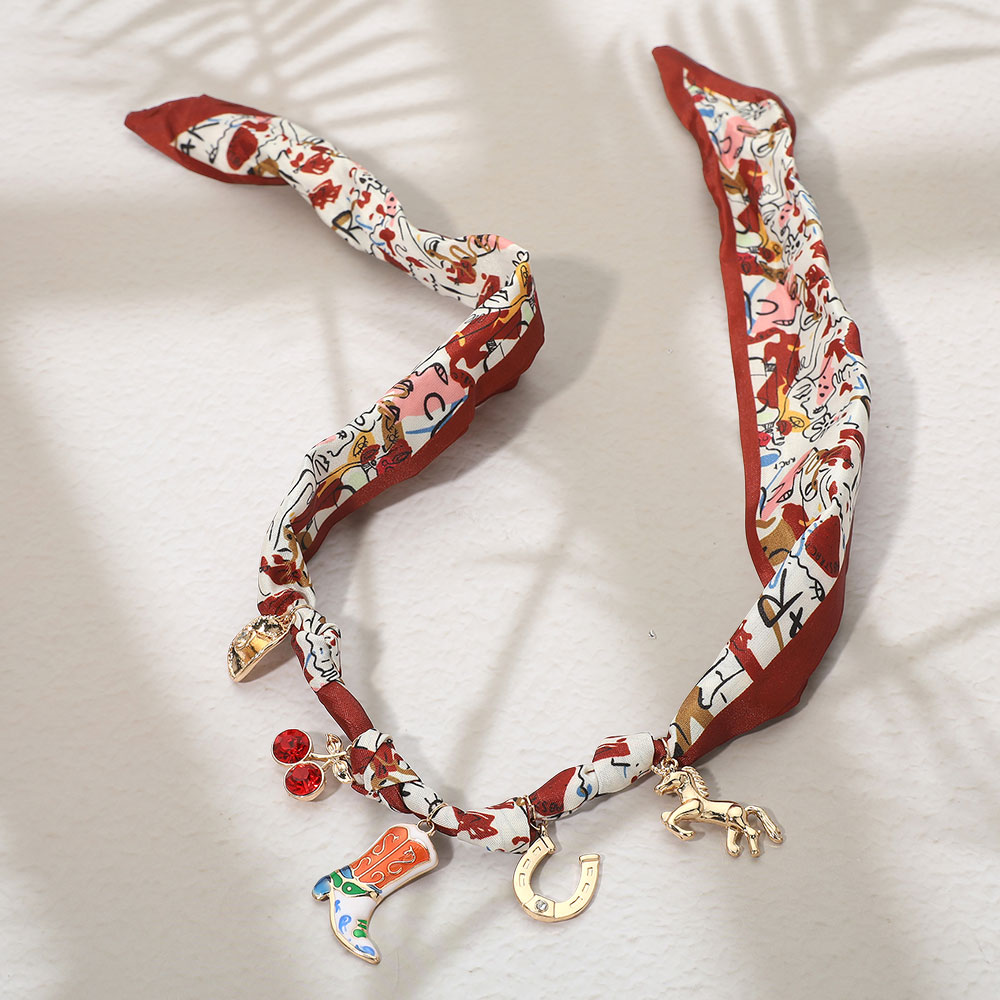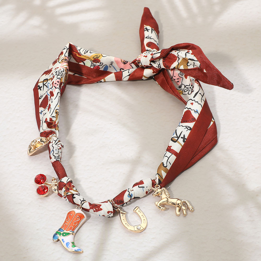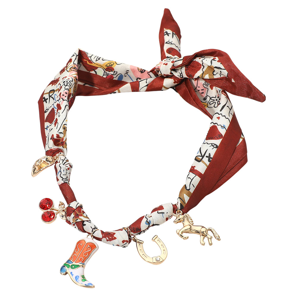 Details • Necklace Size : 27" L • Decor Size : 1.5" L • Adjustable • Print May Vary • Statement scarf tie bracelet accented with playful western-inspired charms for a bold, fashion-forward look. Designed to add character and movement, this bracelet is ideal for trend-driven collections, themed styling, gifting displays, and boutique assortments seeking eye-catching charm accessories. • Lead and Nickel Compliant