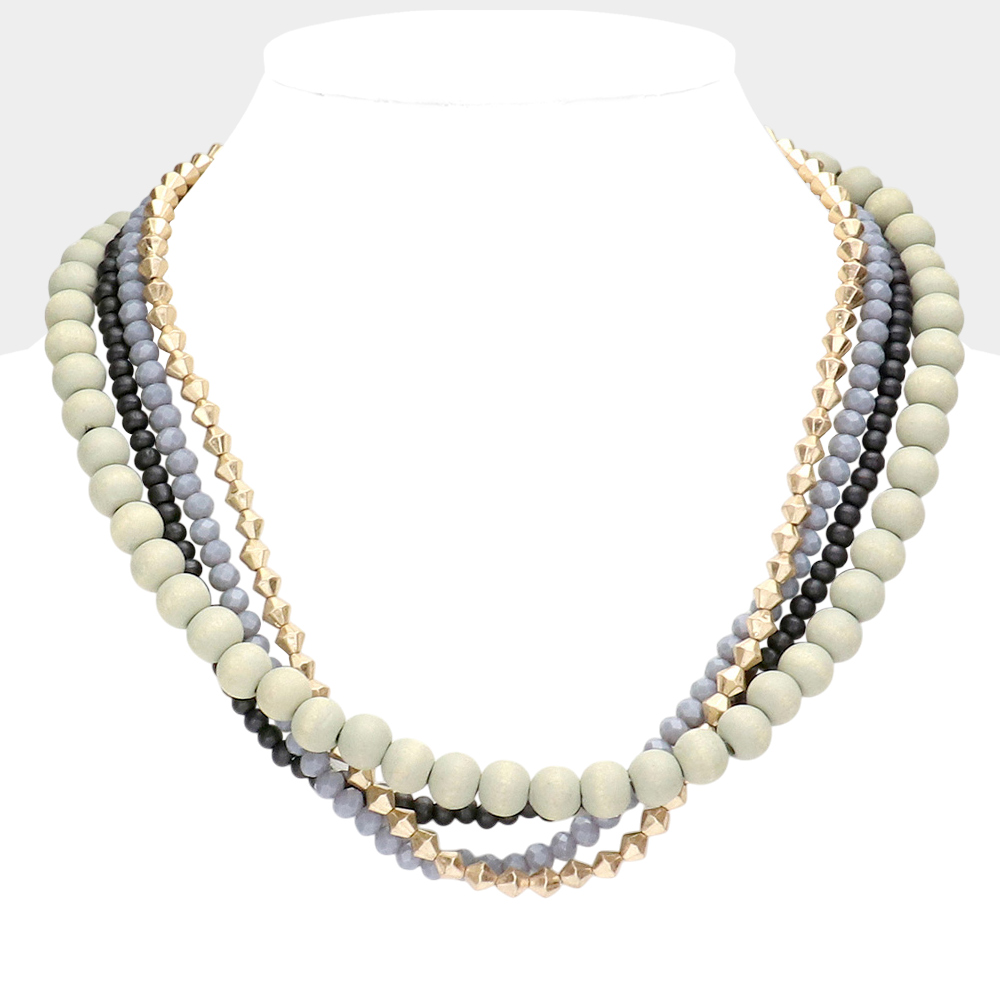 Hammered Metal Cross Pendant Wood Paperclip Chain Layered Necklace