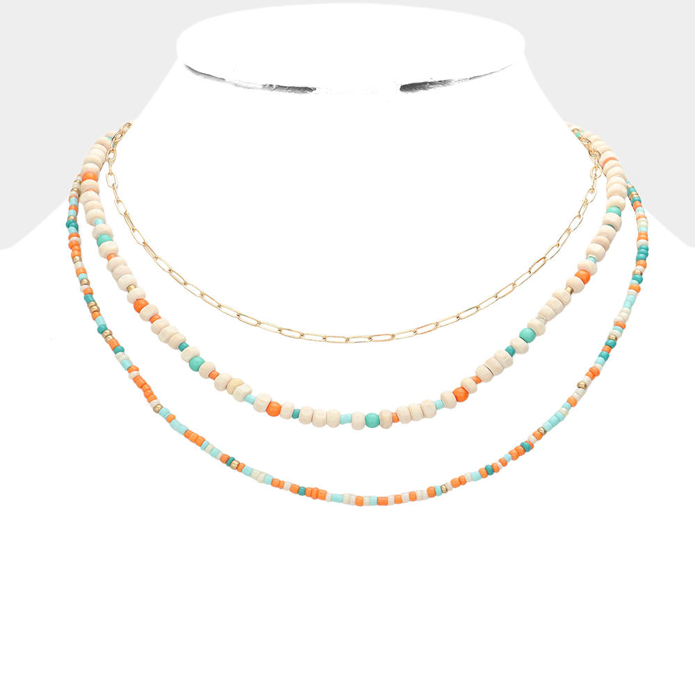 Wood Ball Seed Beaded Triple Layered Bib Necklace