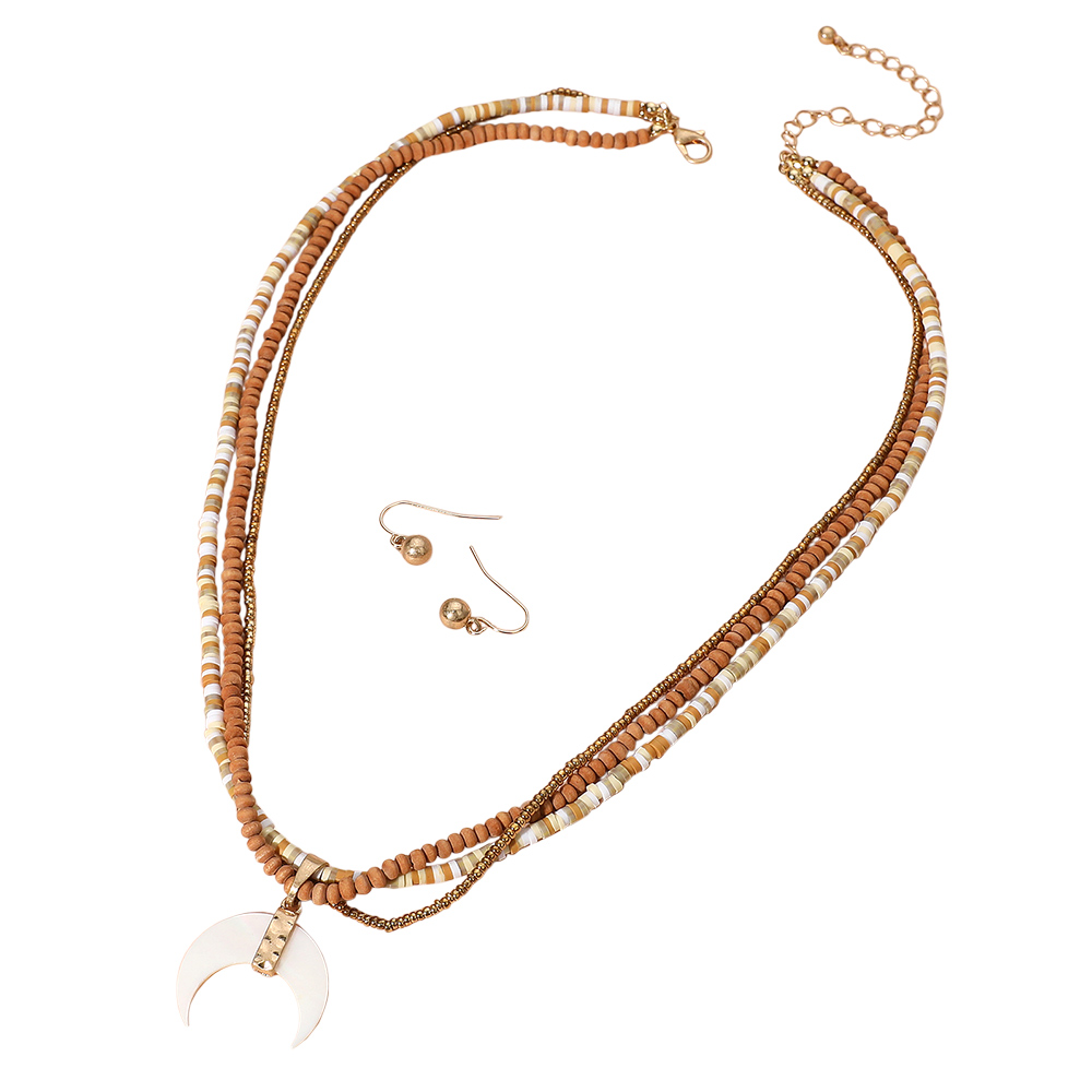 • Stylish layered beaded necklace featuring a crescent pendant, paired with coordinating drop earrings. A bohemian-inspired jewelry set perfect for adding unique charm to casual looks, gifting, or layering with other accessories.