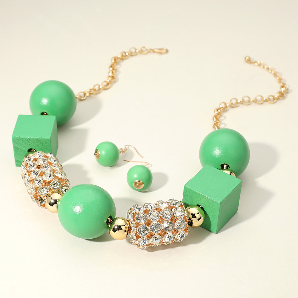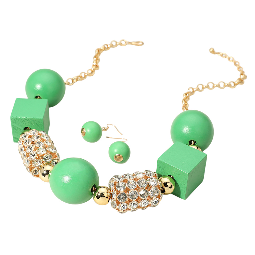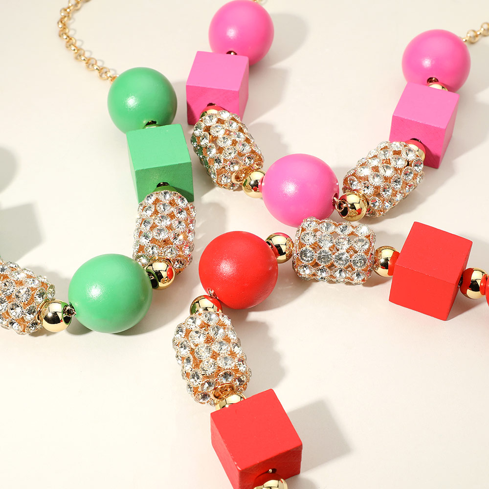 Wooden Ball Cube Rhinestone Tube Link Statement Necklace