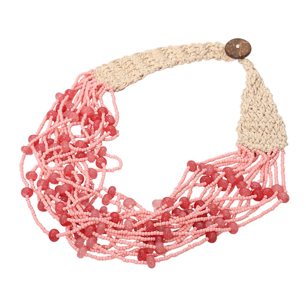 Details • Necklace Size : 20" L • Decor Size : 2" L • Elegant multi strand beaded necklace designed with a textured woven neck accent for a layered statement look. This necklace adds dimension and fluid movement, making it ideal for boutiques seeking relaxed statement accessories that elevate everyday outfits, resort styling, and seasonal collections. • Lead and Nickel Compliant • Made In Korea