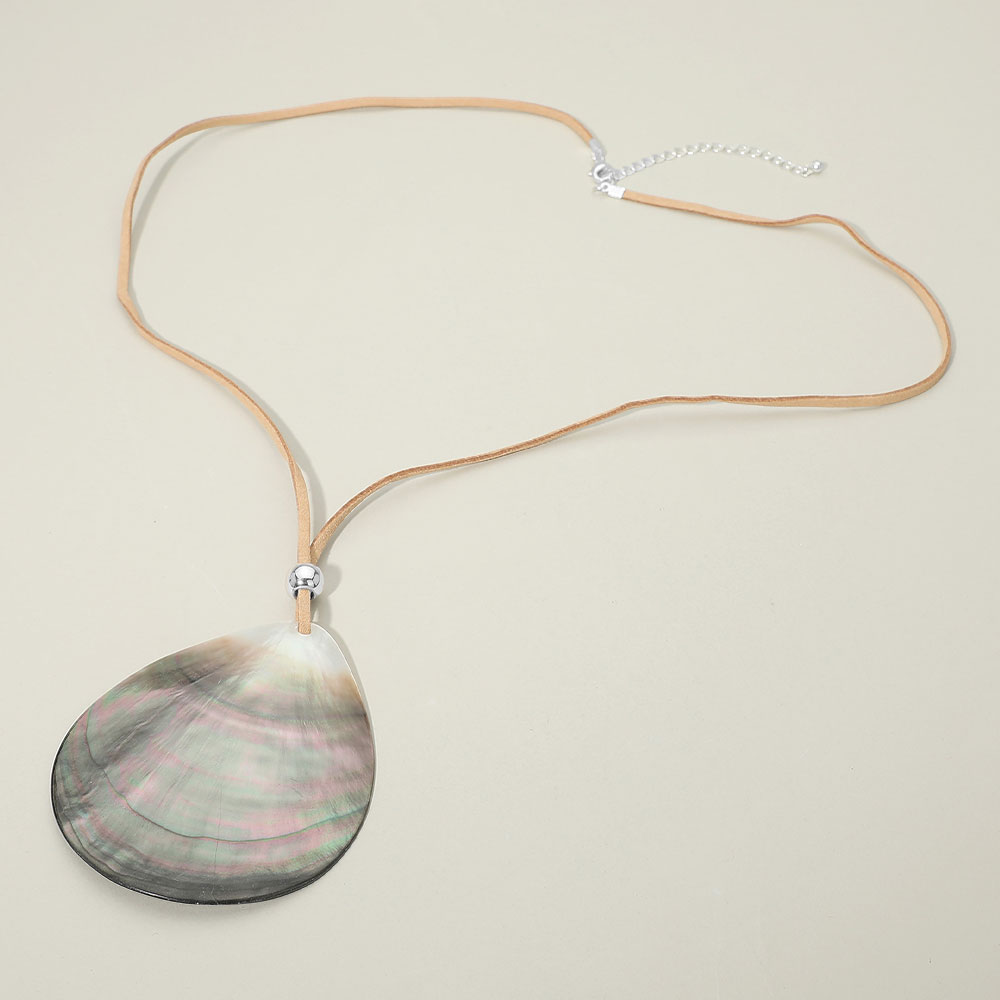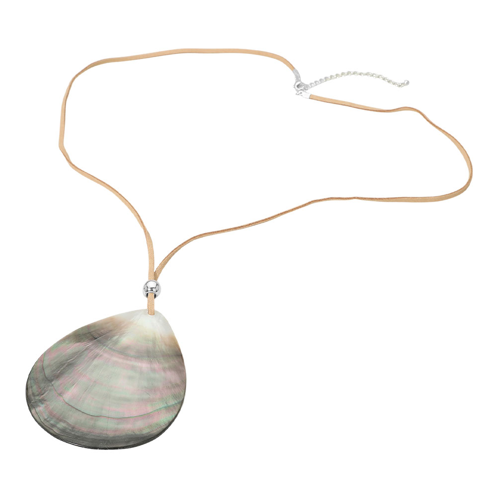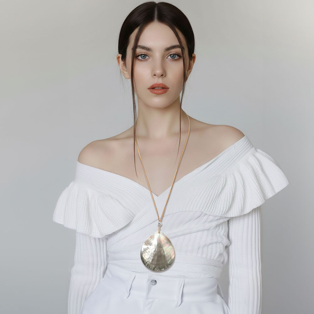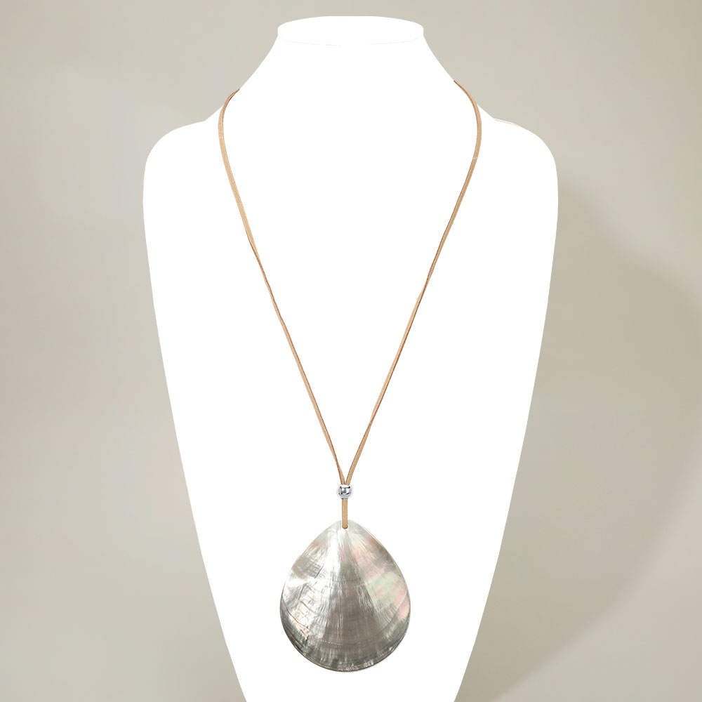 Details • Necklace Size : 30" + 3.25" L • Pendant Size : 3" X 3.5" • A long necklace designed with a smooth abalone teardrop-shaped statement pendant that adds natural elegance and visual interest. This versatile piece complements casual and dressy outfits, making it ideal for layering or standalone styling. A strong choice for boutiques seeking statement jewelry with everyday wear appeal and gift-ready versatility. • Lead and Nickel Compliant