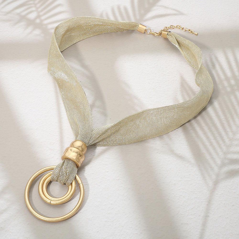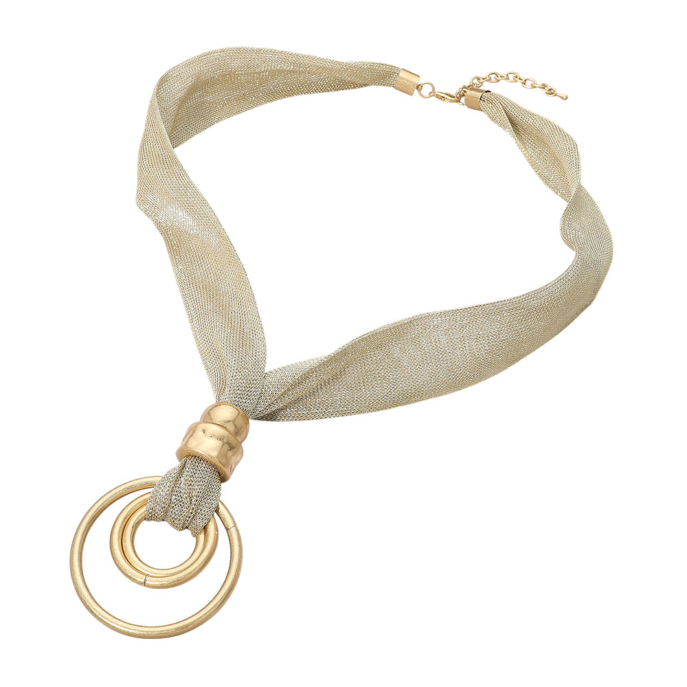 Details • Necklace Size : 35" + 3.25" L • Pendant Size : 2.75" X 4" • Modern statement necklace featuring a wide mesh-style band paired with layered circular pendant accents for a bold, contemporary look. Designed to drape elegantly at the neckline, this necklace elevates everyday outfits, workwear, and special occasions with sleek, fashion-forward appeal.