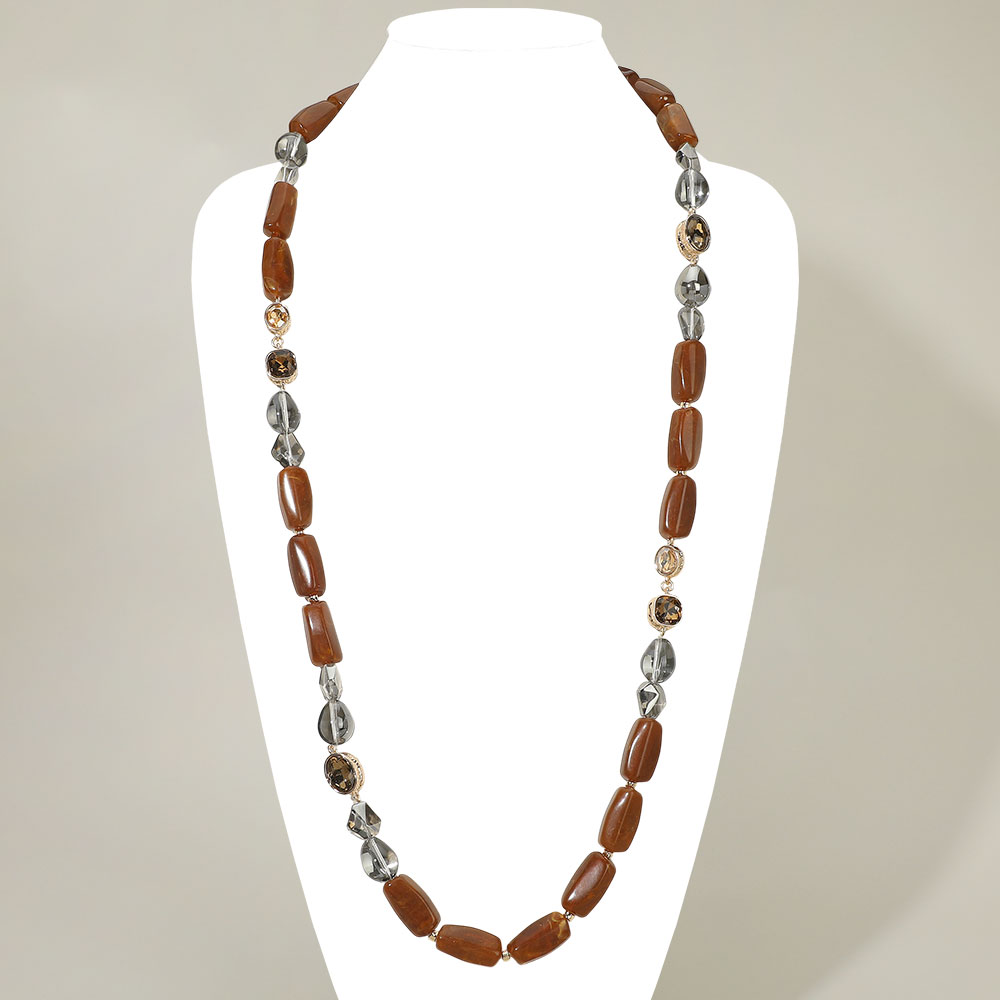 Details • Necklace Size : 42.5" + 4" L • Decor Size : 0.5" L • This long beaded statement necklace features a balanced mix of elongated beads and decorative accents for a refined, eye-catching look. Designed to elevate both casual and polished outfits, it adds texture, movement, and visual interest, making it a versatile choice for boutique and fashion-forward jewelry assortments. • Lead and Nickel Compliant