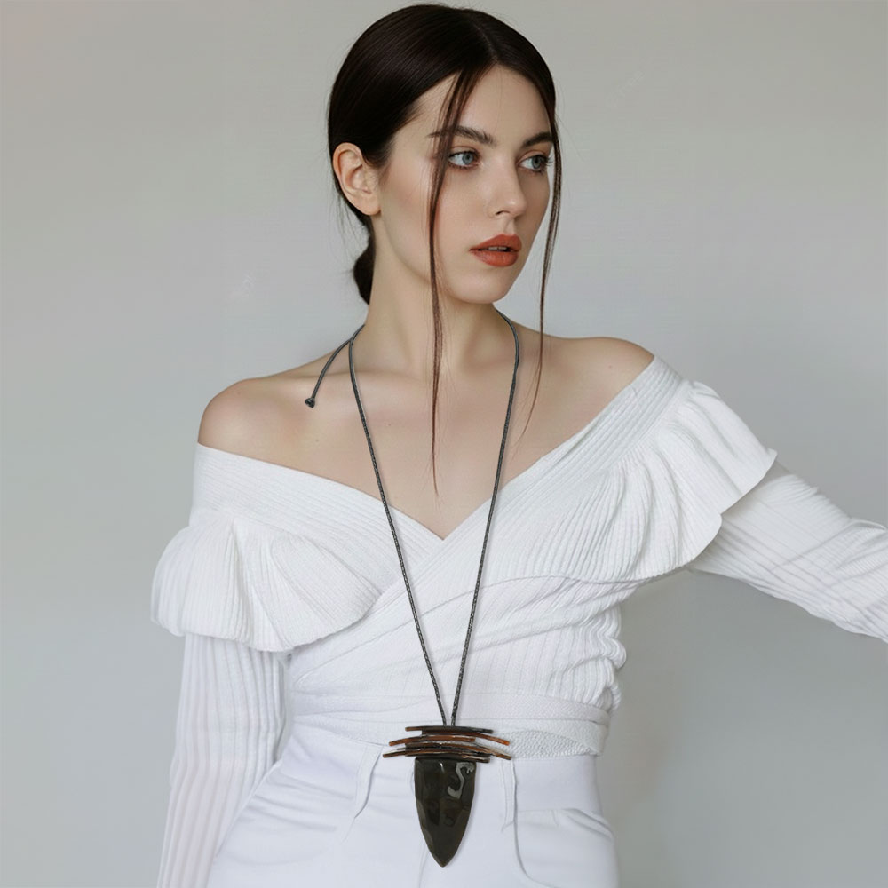 • This adjustable necklace features a bold layered cone pendant with a sculptural, stacked silhouette. Designed to stand out, it offers a modern statement look that pairs effortlessly with casual or elevated outfits, making it a versatile option for everyday styling and boutique jewelry assortments.
