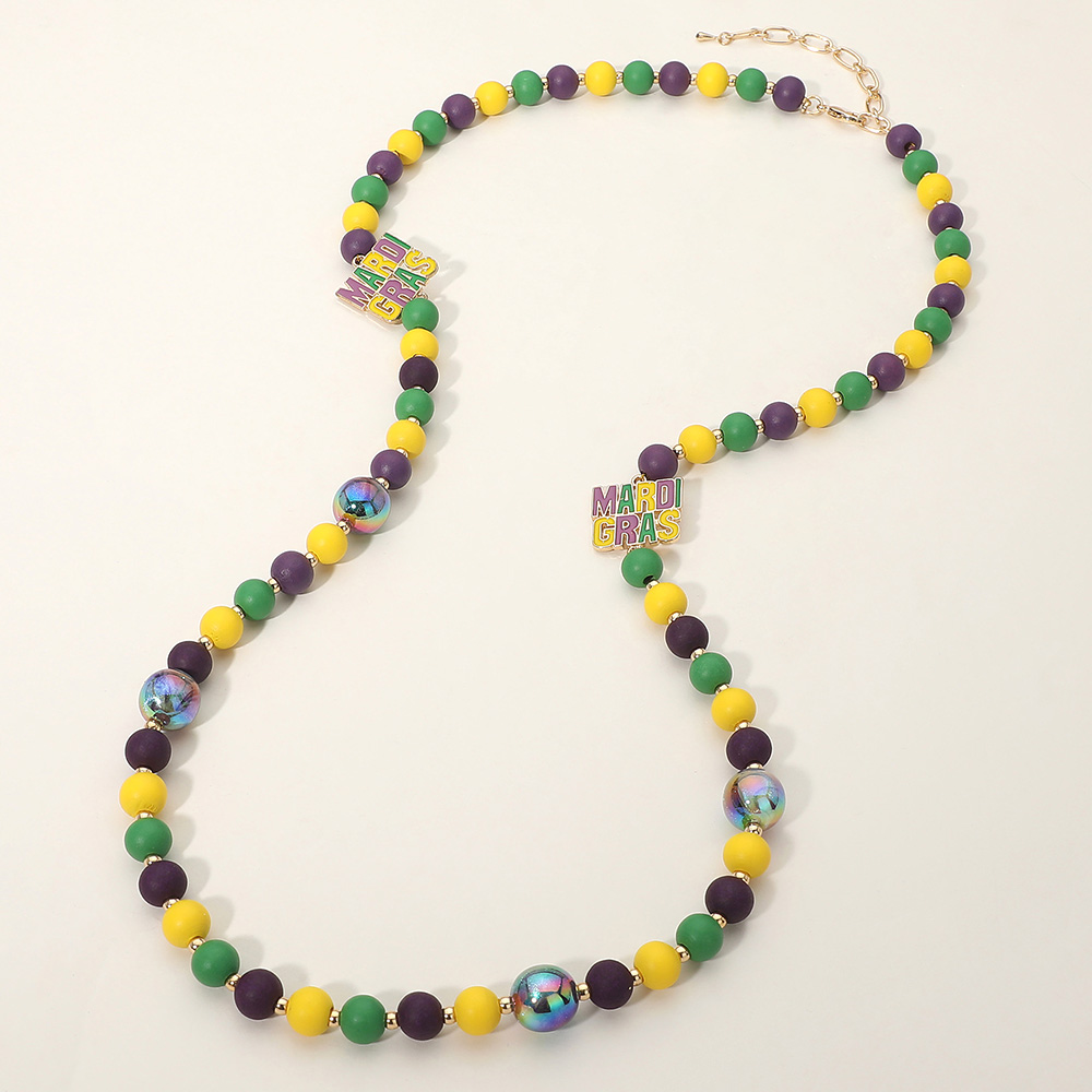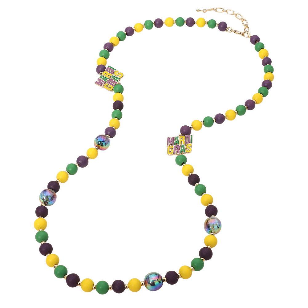 • Statement Mardi Gras–inspired necklace designed with smooth round beads, luminous accent beads, and decorative charm details spaced throughout the strand. Finished with an adjustable chain for comfortable wear. Ideal for parade outfits, themed events, party styling, and festive boutique displays. A versatile accessory that adds playful character and celebration-ready appeal.