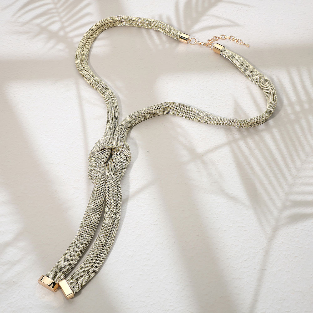 Details • Necklace Size : 33" + 3.25" L • Decor Size : 8" L • Sleek statement necklace featuring a soft, flexible silhouette with a sculptural knot detail for modern elegance. Designed to drape smoothly and add visual interest, this necklace enhances everyday outfits, workwear, and special occasions with refined, fashion-forward appeal. • Lead and Nickel Compliant