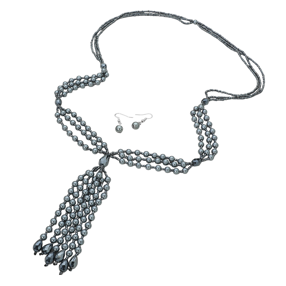 • This beaded necklace set features a layered strand design with an elegant tassel drop centerpiece and matching dangle earrings. Created to make a statement, it’s ideal for evening wear, special events, or elevated everyday styling. A bold yet versatile accessory set perfect for boutiques seeking dramatic silhouette, movement, and refined detail in curated jewelry collections.