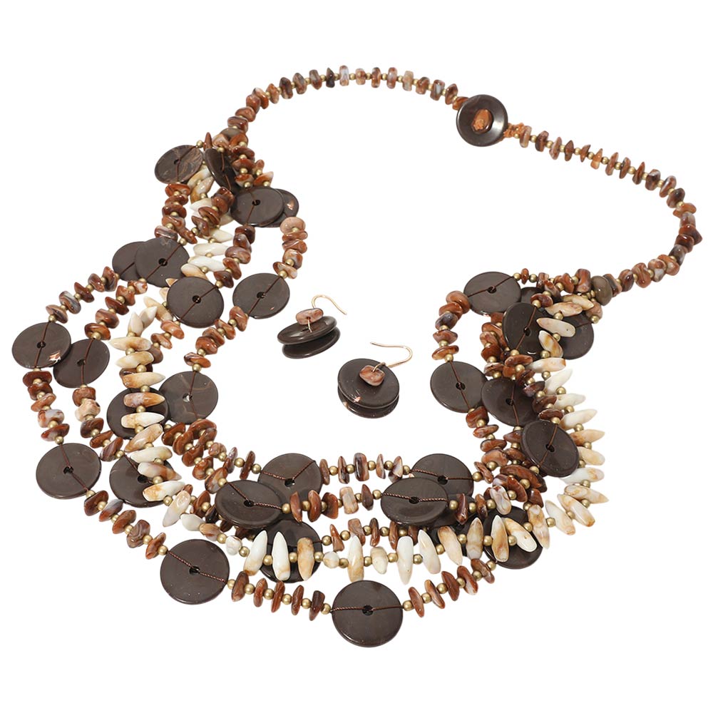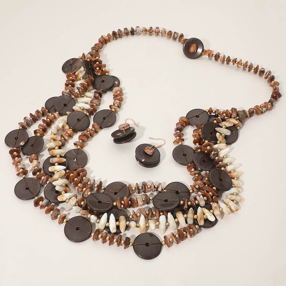 • This layered disc statement necklace set features cascading round accents paired with textured detailing and matching earrings for a bold yet organic look. Designed to elevate boutique collections, it offers strong visual movement and dimension, making it ideal for statement styling, resort-inspired outfits, special occasions, and fashion-forward everyday wear.
