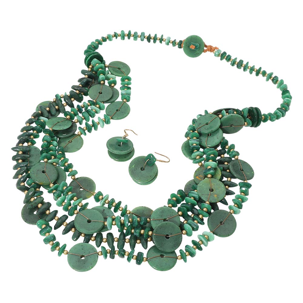 Details • Necklace Size : 32" + 1" L • Decor Size : 2.75" L • Earrings Size : 1.8" L • This layered disc statement necklace set features cascading round accents paired with textured detailing and matching earrings for a bold yet organic look. Designed to elevate boutique collections, it offers strong visual movement and dimension, making it ideal for statement styling, resort-inspired outfits, special occasions, and fashion-forward everyday wear. • Lead and Nickel Compliant