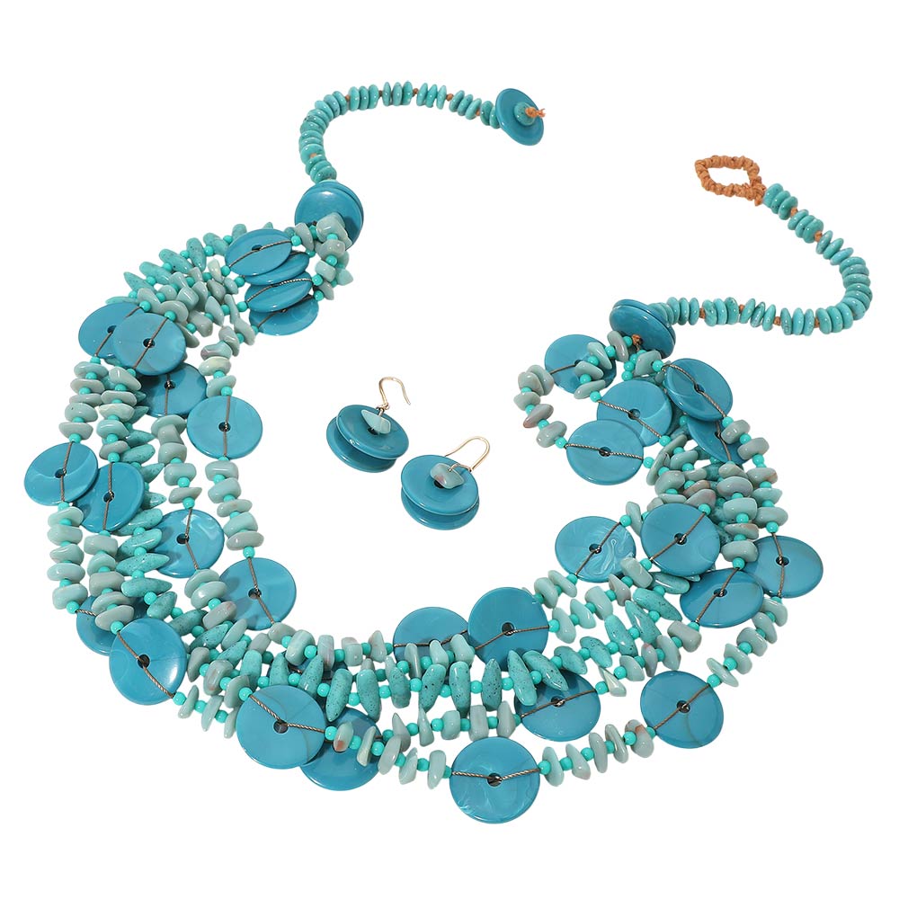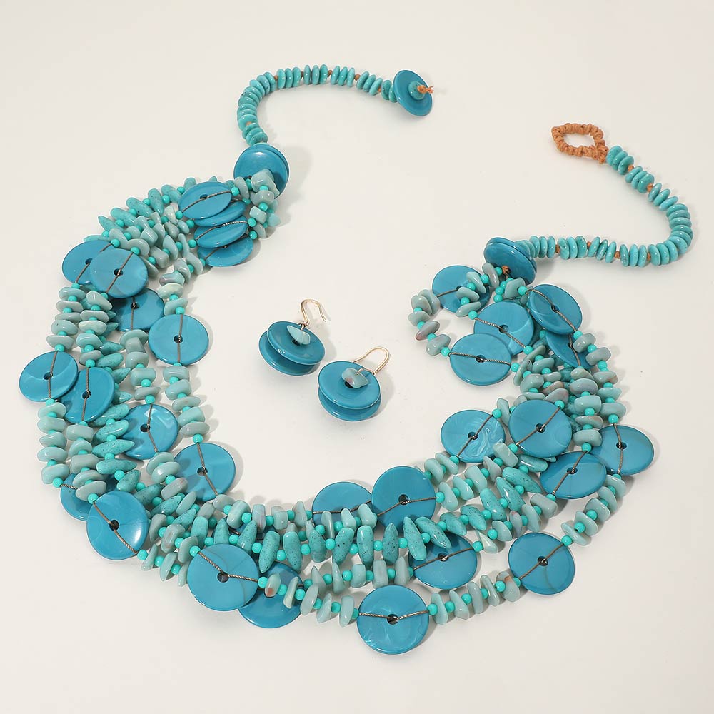 • This layered disc statement necklace set features cascading round accents paired with textured detailing and matching earrings for a bold yet organic look. Designed to elevate boutique collections, it offers strong visual movement and dimension, making it ideal for statement styling, resort-inspired outfits, special occasions, and fashion-forward everyday wear.