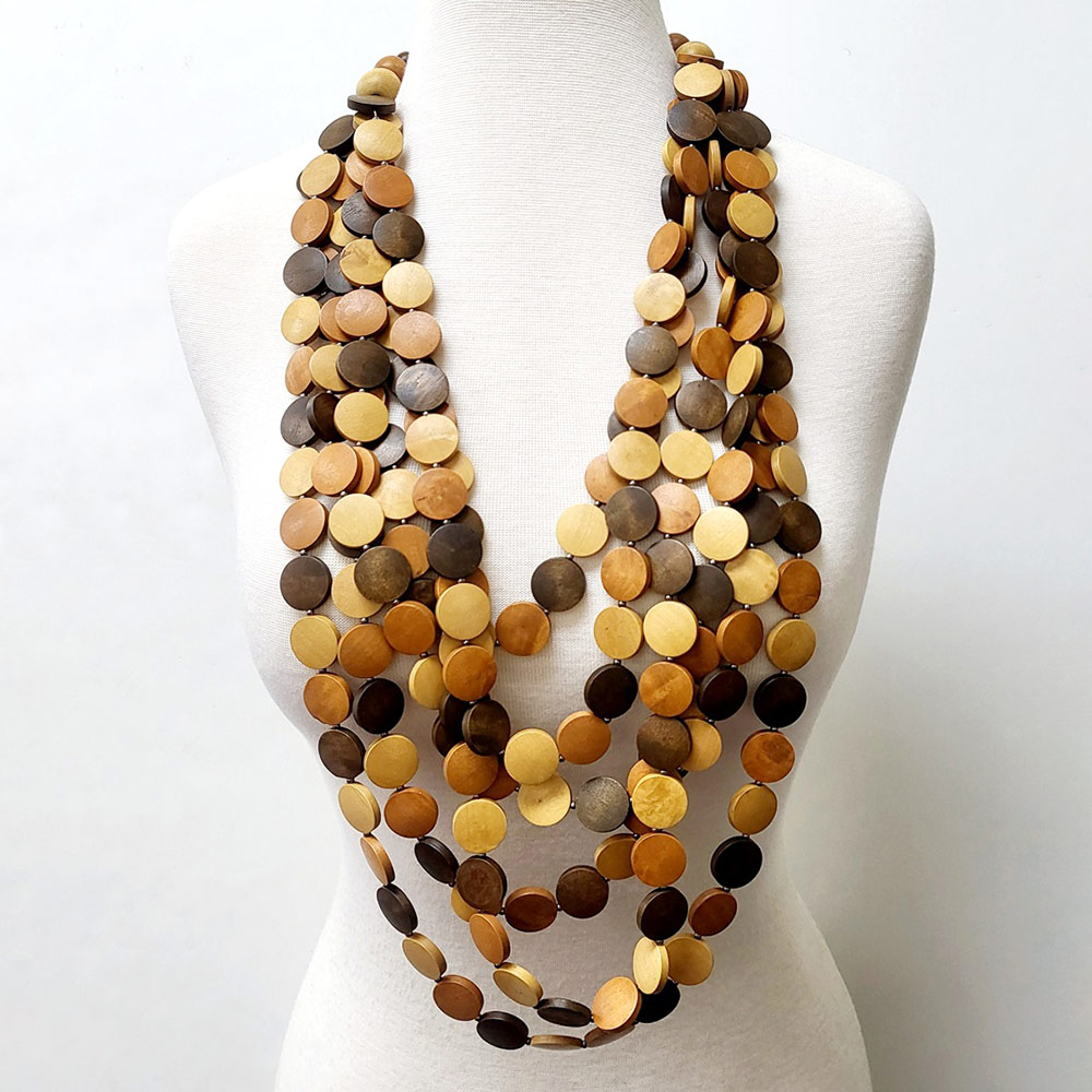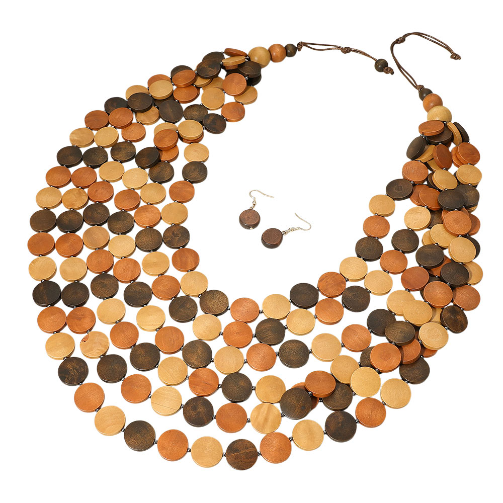 Wooden Disc Beaded Multi Layered Long Statement Necklace