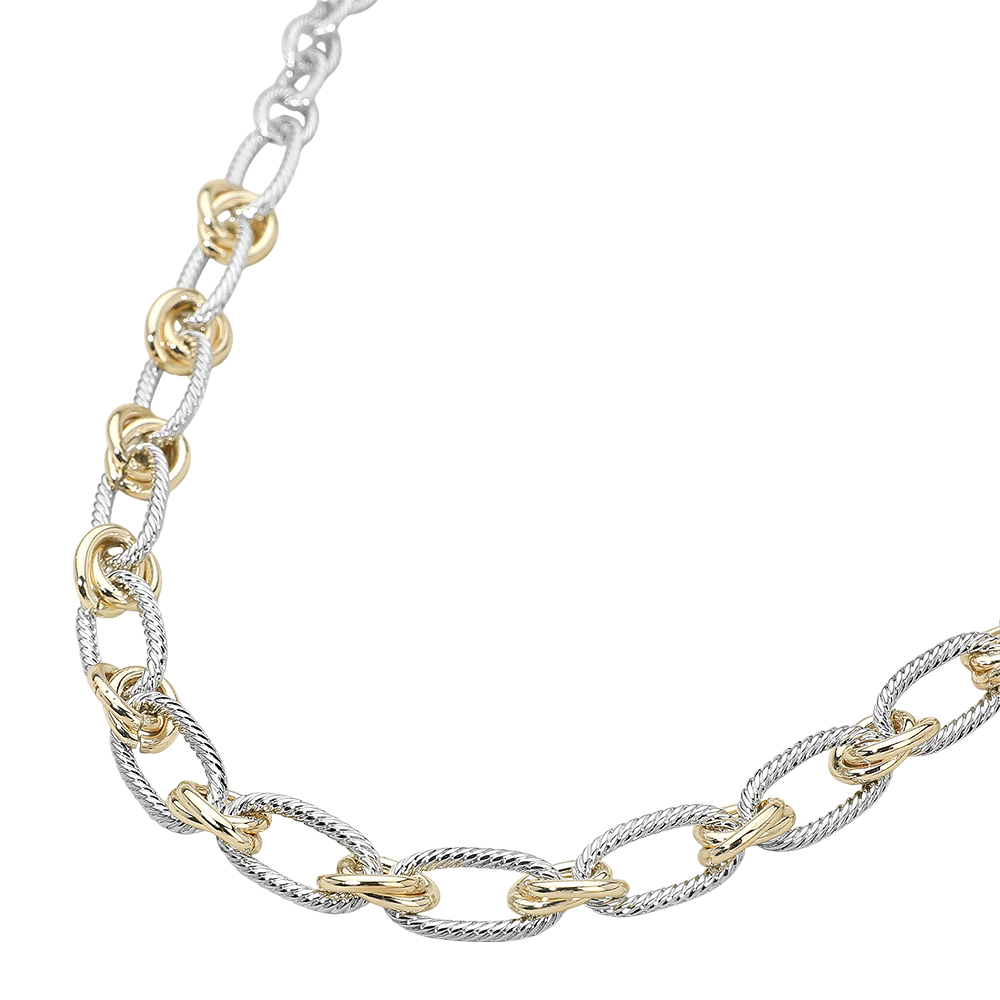 Details • Necklace Size : 17" + 2" L • Decor Size : 0.4" L • A versatile chain necklace with textured rope-style oval links accented by polished knot connectors. Its unique interplay of texture and shine makes it a standout statement piece, perfect for layering or wearing solo for a modern, sophisticated look. • Gold Dipped