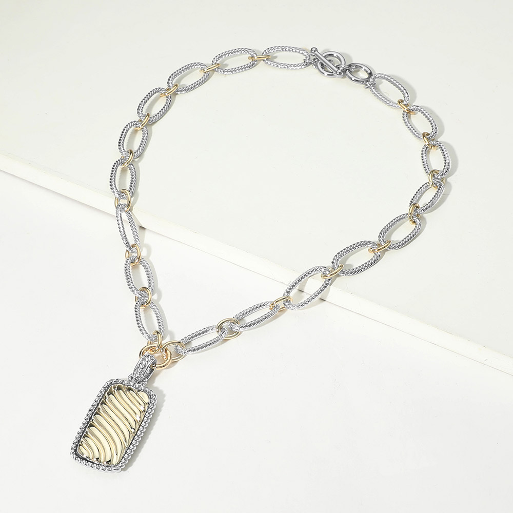 Details • Necklace Size : 17" + 1" L • Pendant Size : 0.75" X 1.75" • Toggle Closure • This rectangle pendant mixed link chain necklace features a textured statement charm paired with bold oval links for a modern, elevated look. Designed to stand out on its own or layer effortlessly, it adds structure and style to everyday outfits, workwear, and evening looks. A versatile choice for gifting and curated jewelry collections. • Gold Dipped