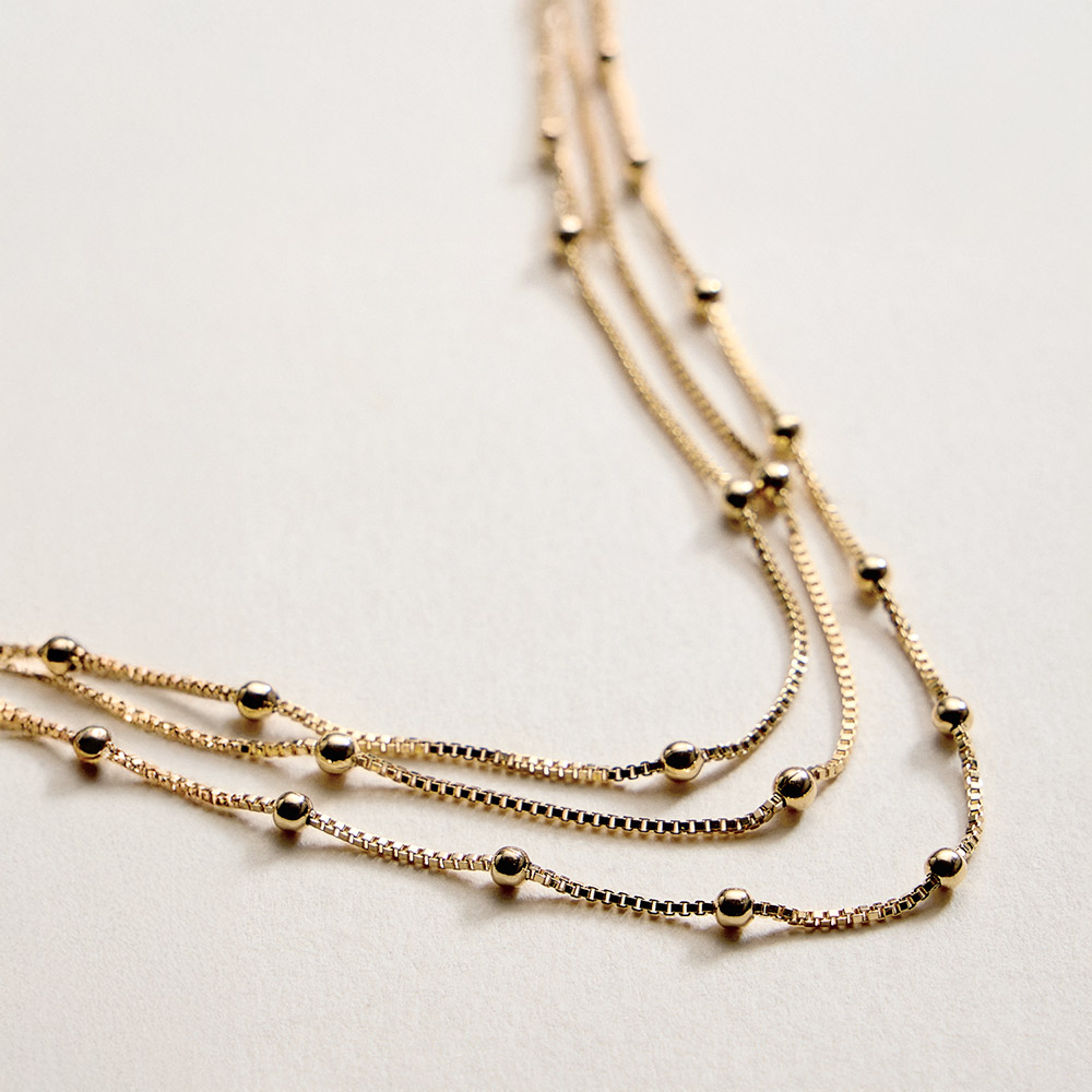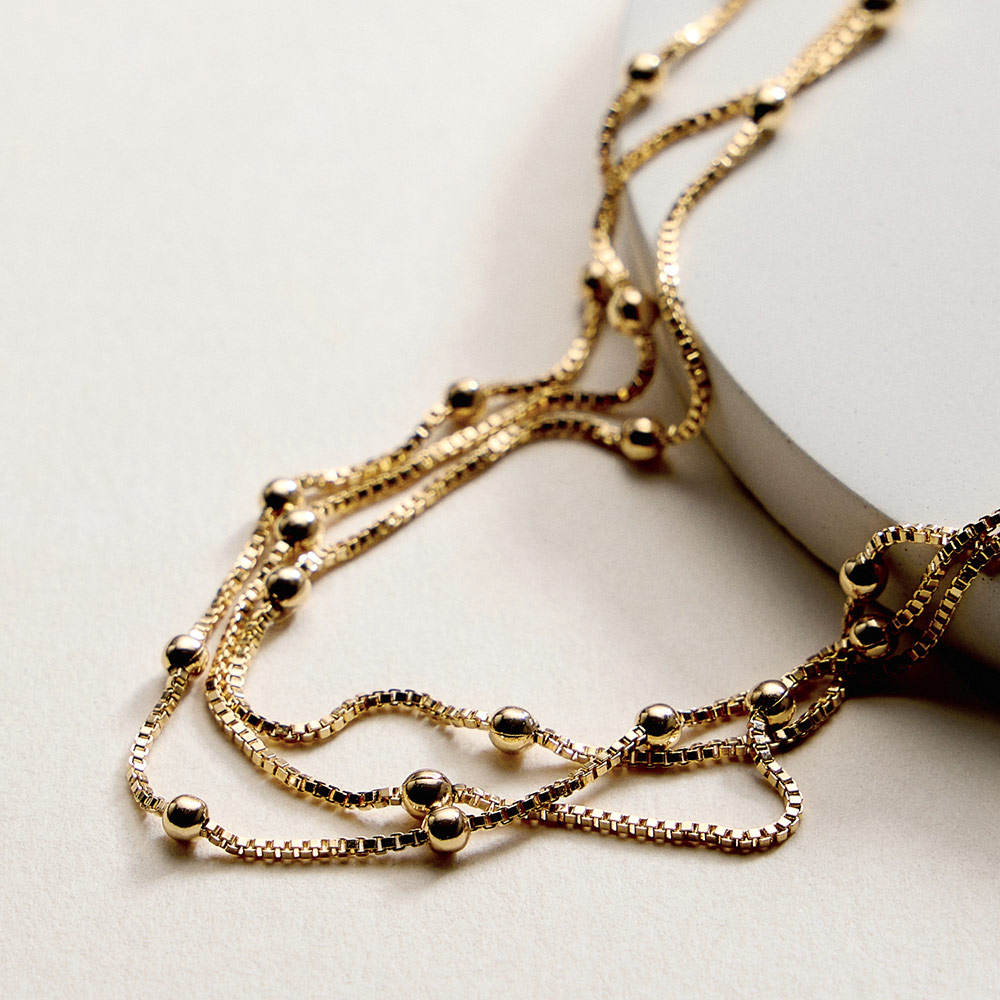 Details • Necklace Size : 17.5" + 1.5" L • Decor Size : 1" L • Delicate layered chain bracelet designed with evenly spaced bead accents for a refined, modern look. Ideal for everyday wear, stacking with other bracelets, or minimalist styling. A versatile accessory that adds subtle movement and elegance to casual outfits, workwear, and thoughtful gifting moments. • Gold Filled • Hypoallergenic • Lead and Nickel Compliant • Made In Brazil