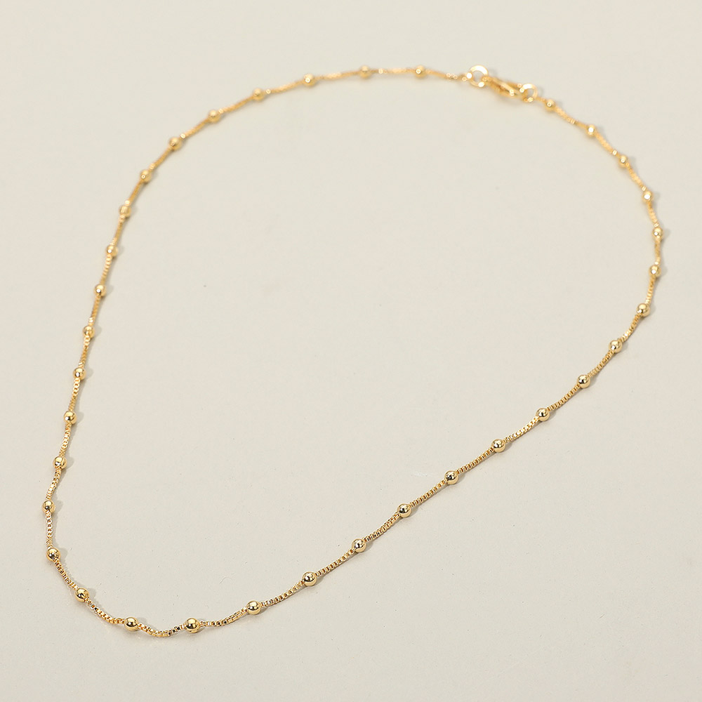 Details • Necklace Size : 16" L • Decor Size : 0.1" L (2mm) • Refined bead station necklace featuring evenly spaced polished dots along a slender chain. Lightweight and elegant, this timeless piece adds a touch of understated luxury—perfect for everyday wear or layering with other necklaces. • Gold Filled • Lead and Nickel Compliant • Made In Brazil