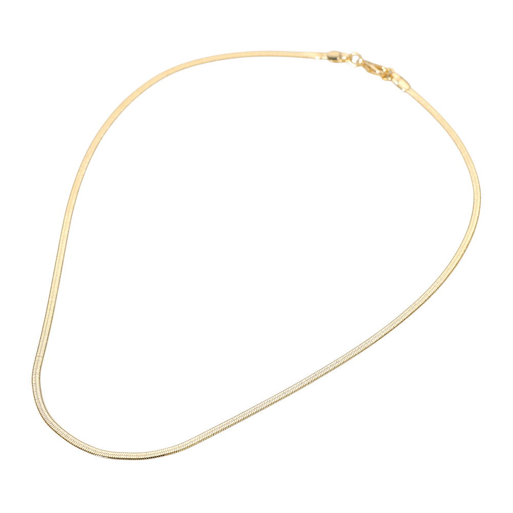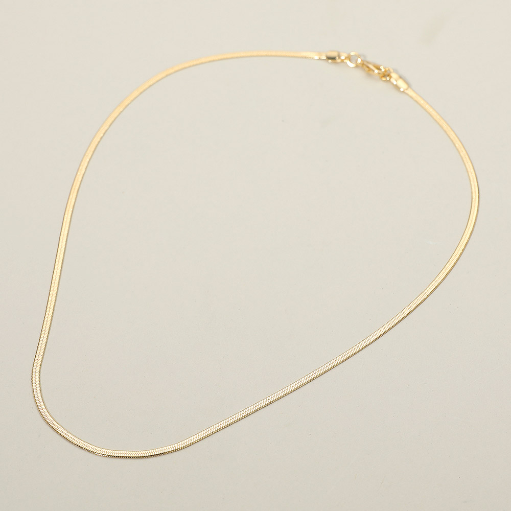 Details • Necklace Size : 16" L • Decor Size : 0.1" L (2mm) • Chic flat herringbone chain necklace featuring a fluid, reflective surface that drapes gracefully along the neckline. Its minimalist elegance and versatile design make it a timeless piece perfect for layering or wearing alone for a refined, modern look. • Lead and Nickel Compliant • Gold Filled • Made In Brazil