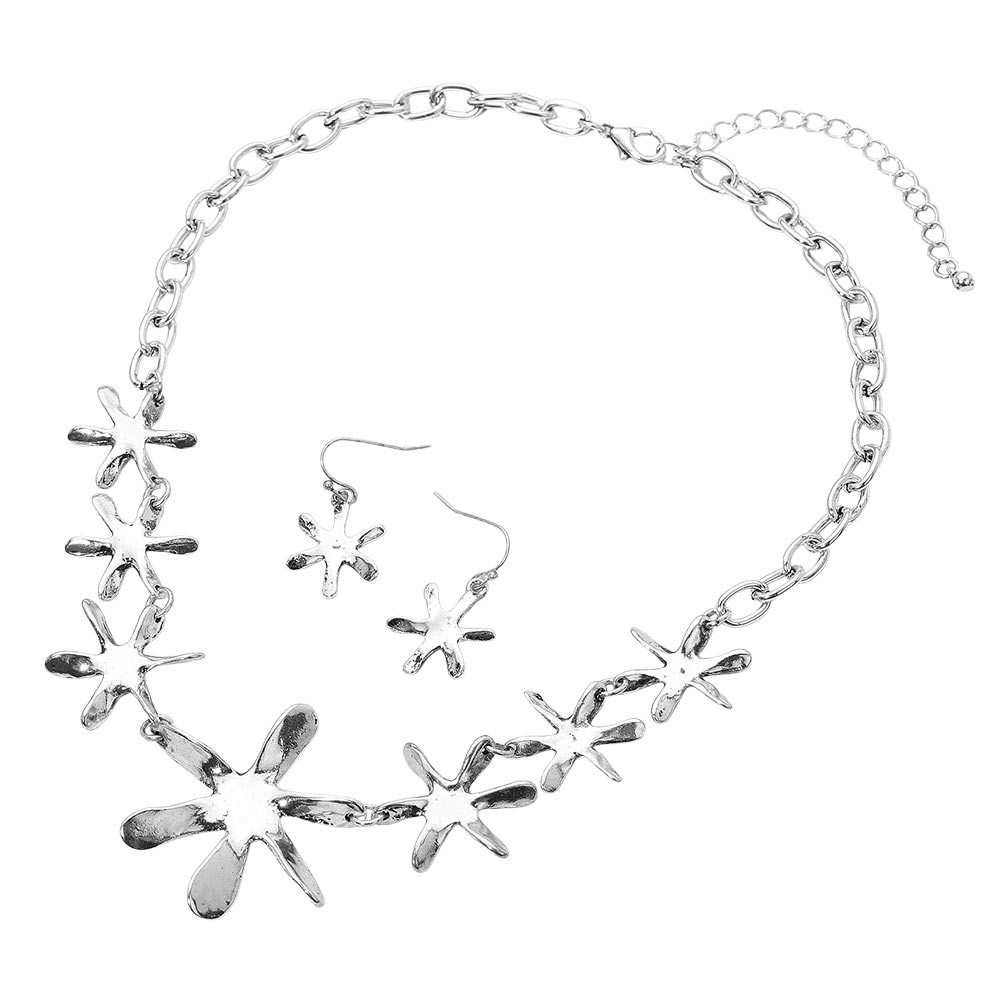 • Contemporary necklace and earrings set featuring abstract flower-shaped charms in a mixed metallic finish. The bold geometric design adds modern flair and artistic edge, making it a standout accessory for casual outfits or elegant evening looks.