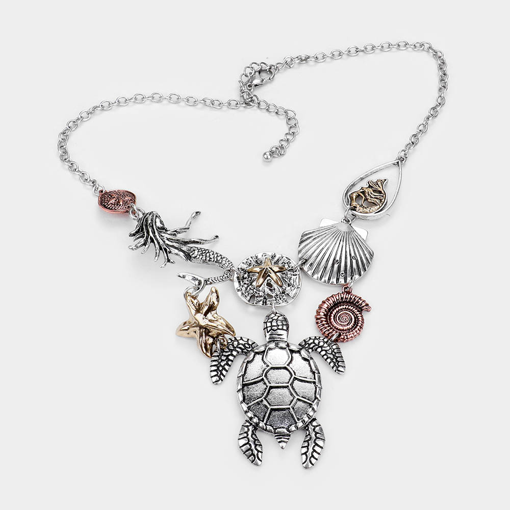 Antique Metal Turtle Sea Life Link Bib Necklace