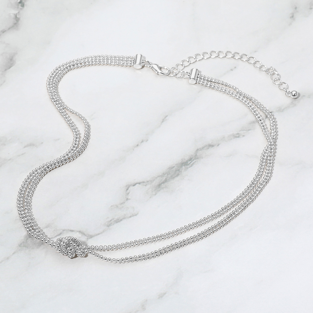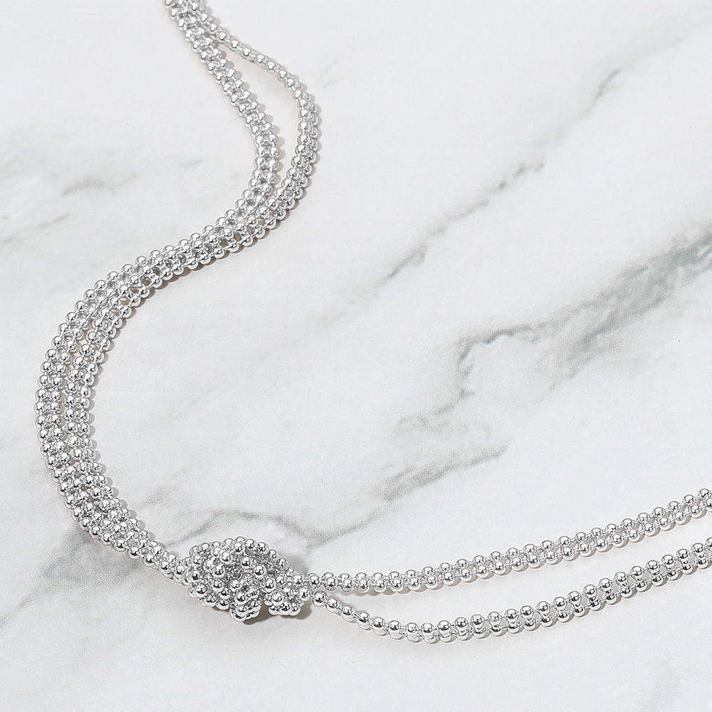• A chic statement necklace crafted with polished beaded strands tied into a bold knot design. The layered look and textured shine make it a versatile accessory that stands out whether worn with casual outfits or evening styles. Lightweight yet eye-catching, this necklace adds instant sophistication and a modern edge.