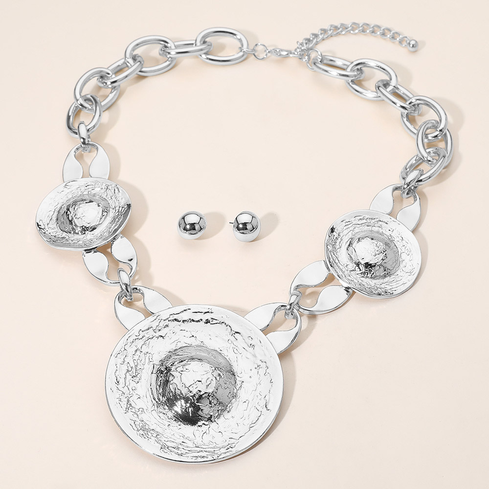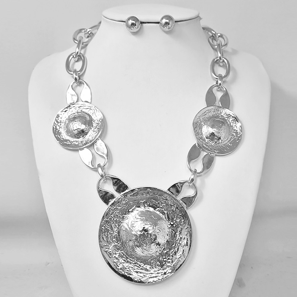 Details • Necklace Size : 22" + 3" L • Decor Size : 3" L • Earrings Size : 0.5" L • This hammered disc link necklace set showcases bold, circular pendants with a textured finish that reflects modern elegance. The chunky link chain adds a statement edge, while the matching stud earrings complete the coordinated look, perfect for refined or contemporary occasions. • Lead and Nickel Compliant
