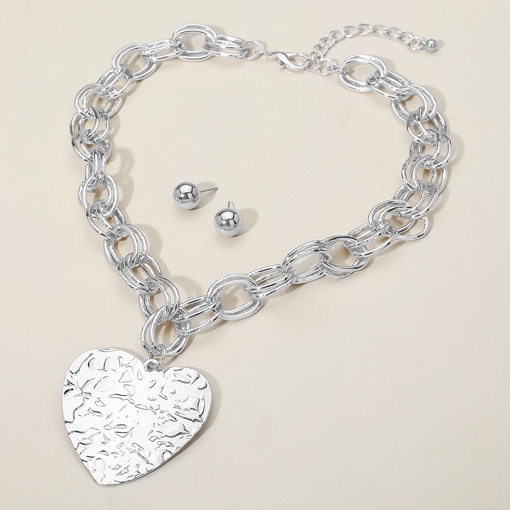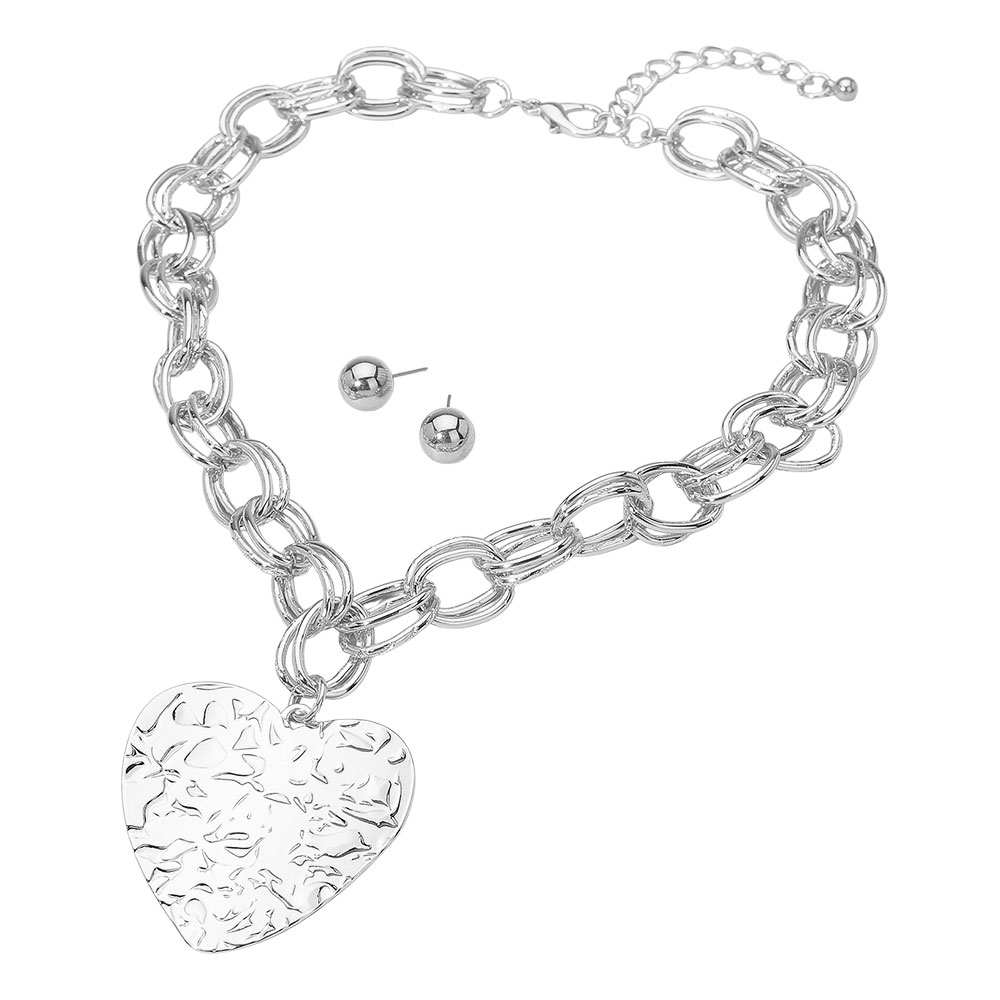 Details • Necklace Size : 20" + 3" L • Pendant Size : 2.2" X 2.2" • Earrings Size : 0.5" L • Statement necklace and earring set featuring a bold chain design with a large hammered heart pendant. The matching stud earrings complete this elegant, modern look that blends romance with sophistication, perfect for dressing up any outfit with effortless style. • Lead and Nickel Compliant
