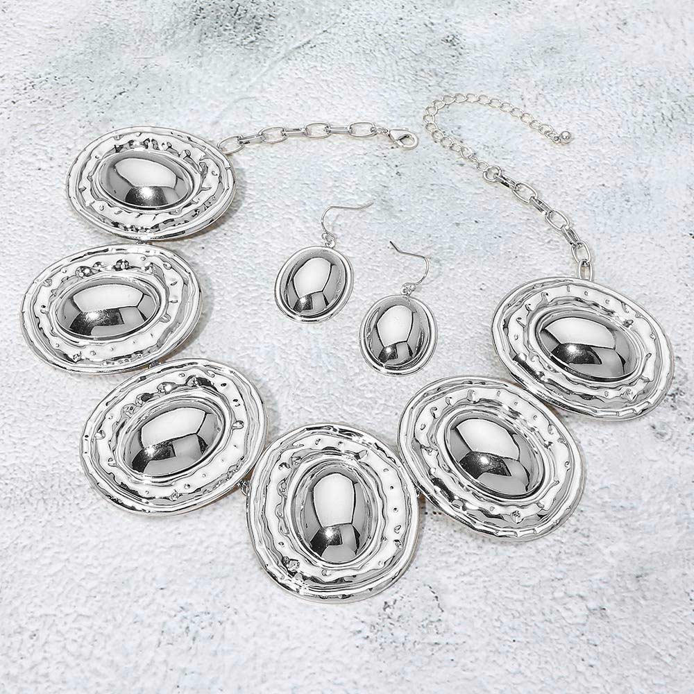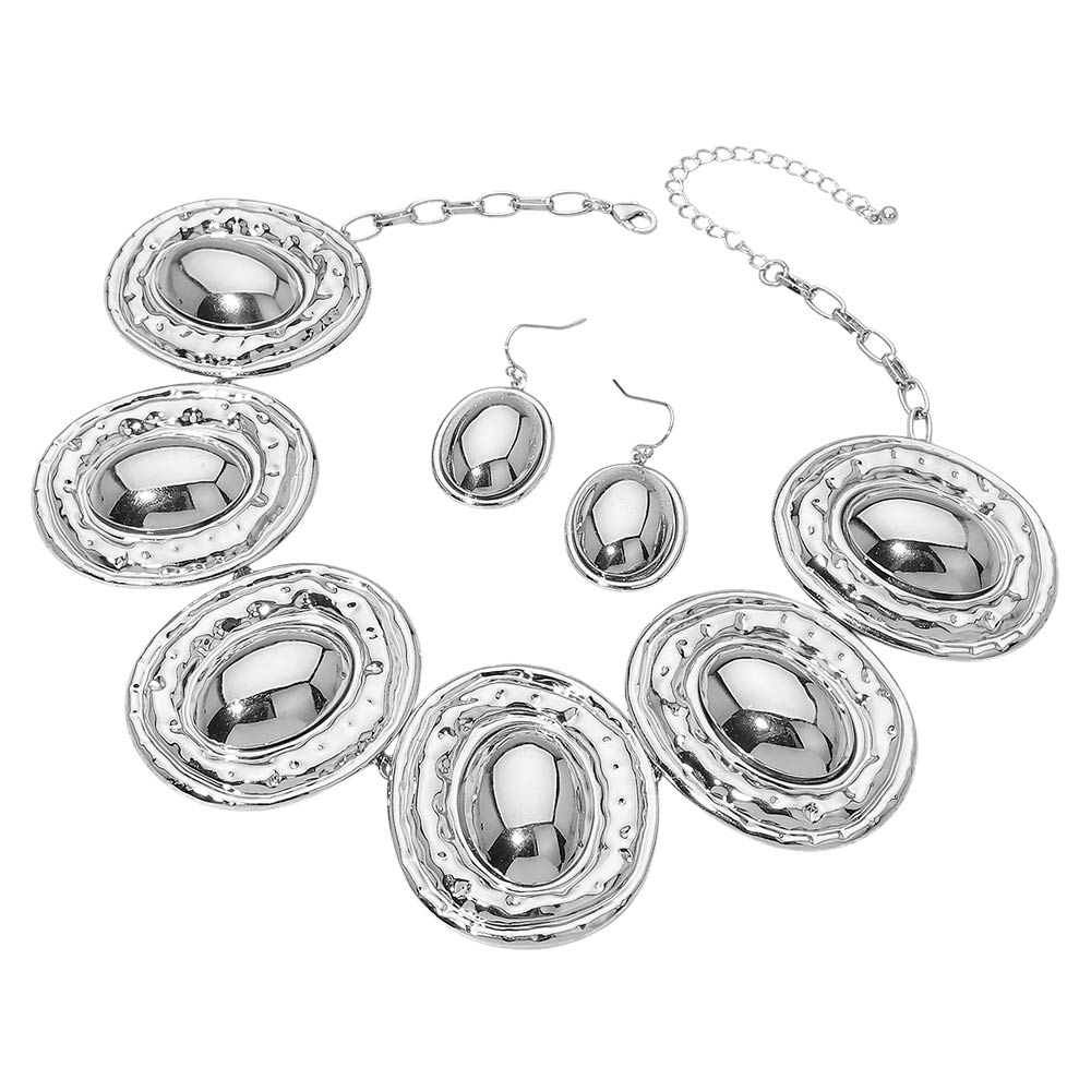 • Bold statement necklace and matching earring set designed with layered oval medallion elements and a sculpted, dimensional profile. This coordinated jewelry set creates a strong focal point for elevated styling, special occasions, and boutique assortments, offering a balanced mix of modern structure and timeless statement appeal that pairs easily with both casual and dress-forward looks.