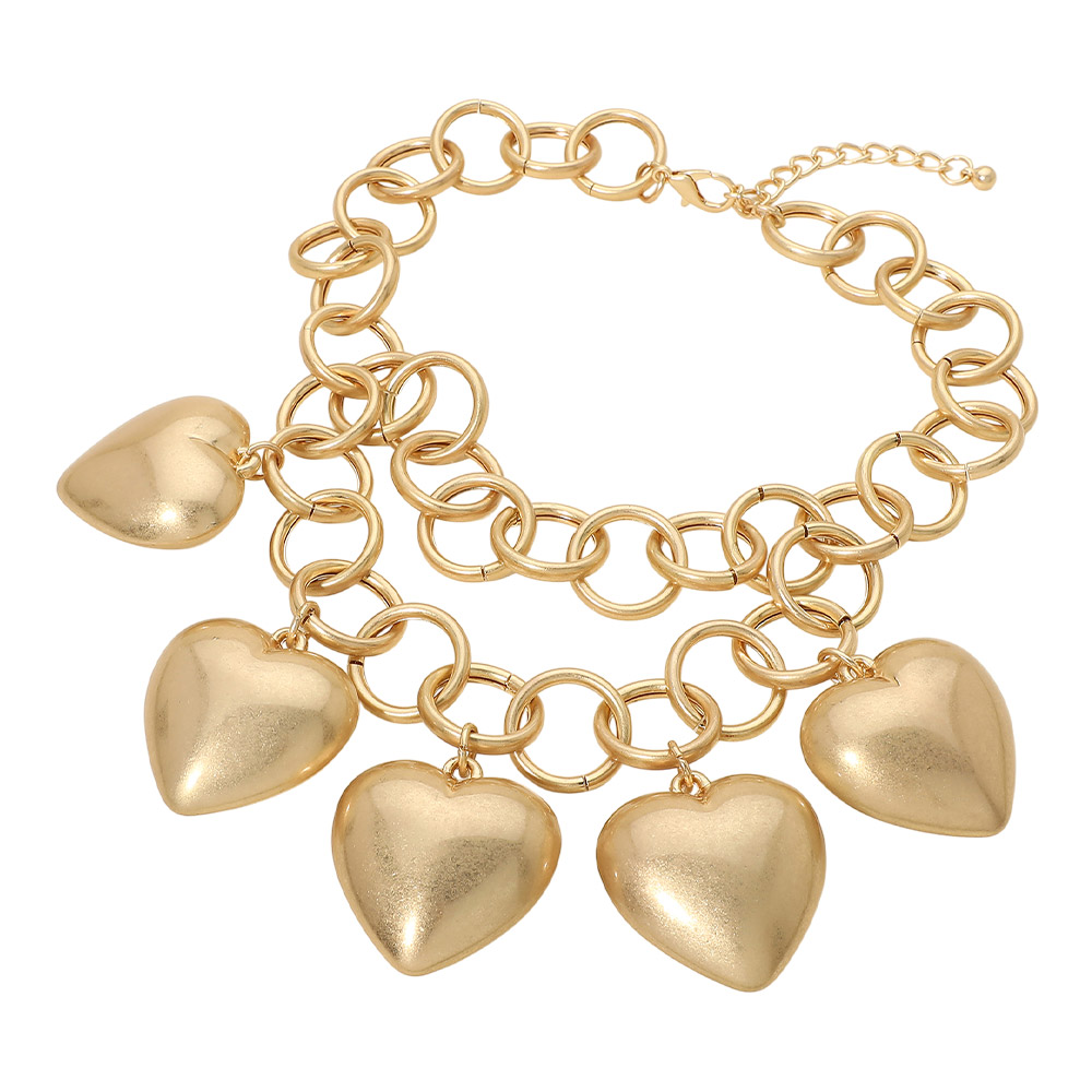Bold Puffy Metal Heart Charm Station Linked Chain Layered Statement Necklace Bold Puffy Metal Heart Charm Station Linked Chain Layered Statement Necklace