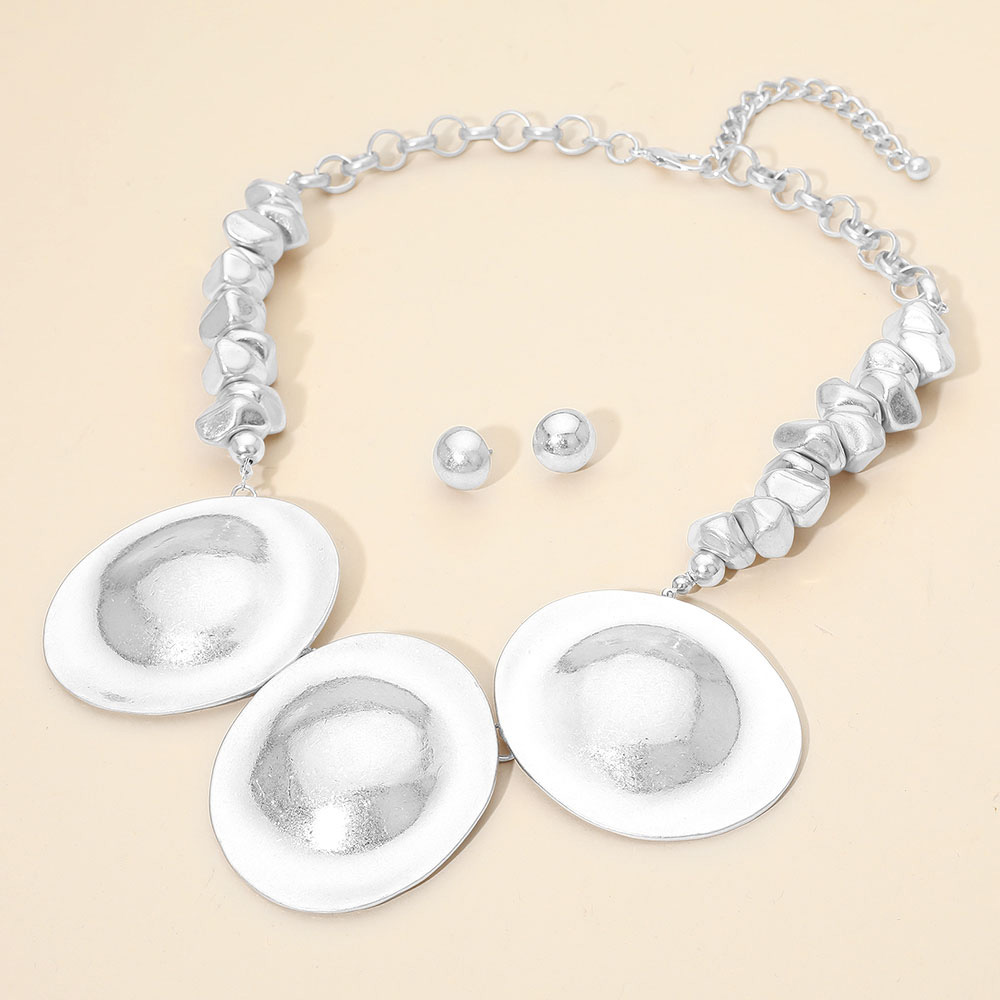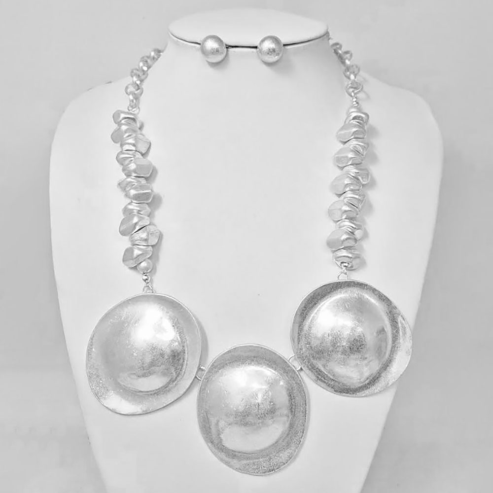• Elevate your look with this striking necklace featuring sculpted disc accents paired with classic stud earrings. Designed for bold, artistic style, this set adds a dramatic touch to evening outfits, special events, or statement fashion moments, offering standout elegance with a modern, eye-catching finish.