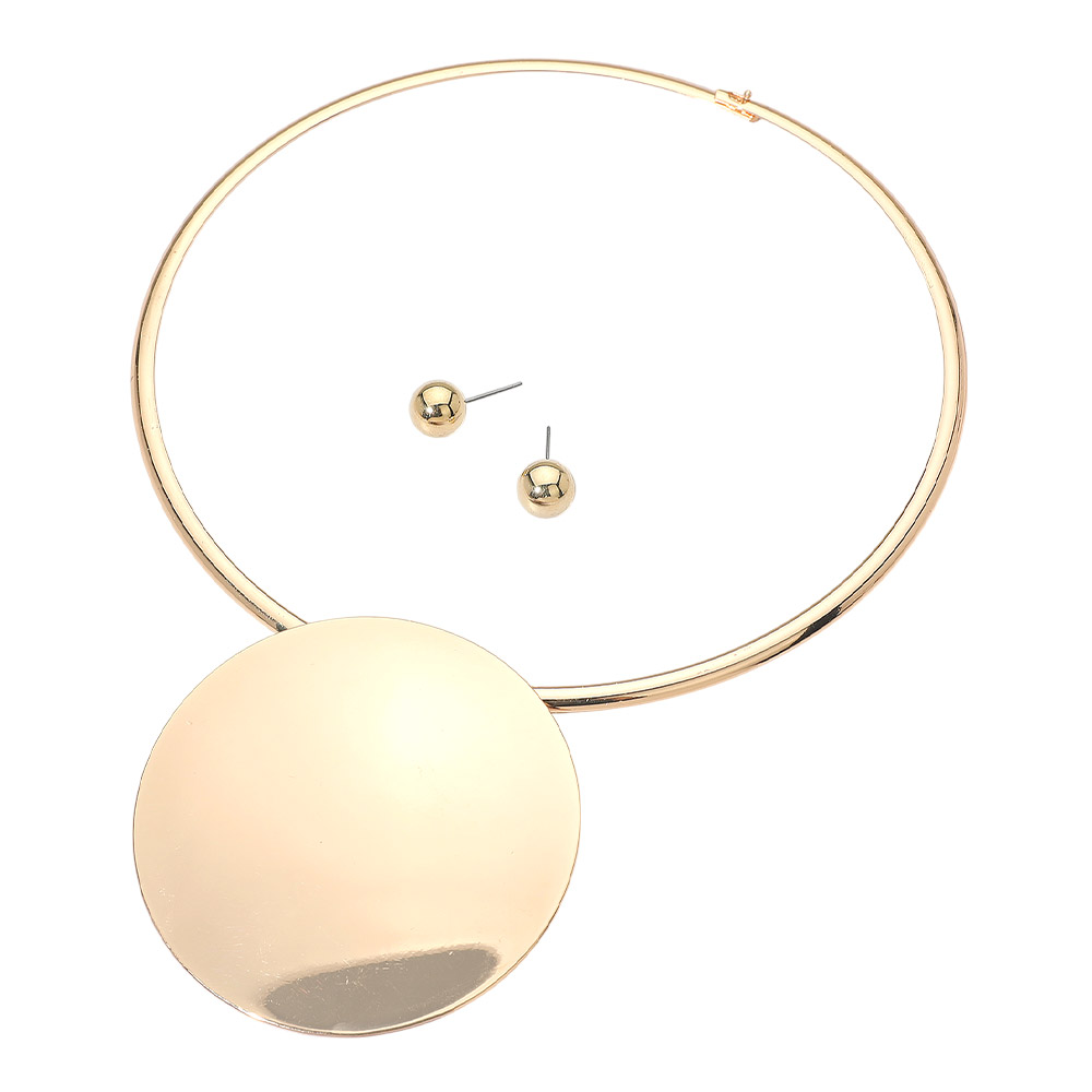 • Make a bold statement with this modern round pendant necklace and matching stud earring set. The sleek, minimalist design and polished finish create a striking contemporary look. Perfect for adding effortless sophistication and artistic flair to any outfit or occasion.