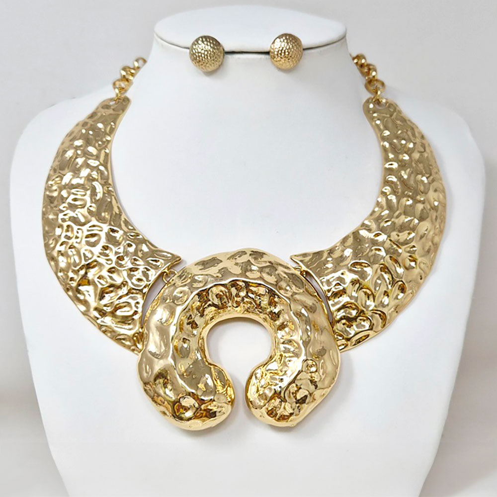 Details • Necklace Size : 19" + 3" L • Decor Size : 3" L • Earrings Size : 0.7" L • Command attention with this bold textured collar necklace and matching earrings. Featuring a sculpted crescent design with artistic detailing, this statement set adds modern sophistication and a touch of drama, perfect for evening wear or standout fashion moments. • Lead and Nickel Compliant