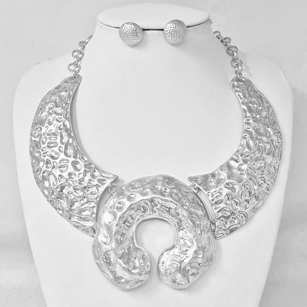 • Command attention with this bold textured collar necklace and matching earrings. Featuring a sculpted crescent design with artistic detailing, this statement set adds modern sophistication and a touch of drama, perfect for evening wear or standout fashion moments.