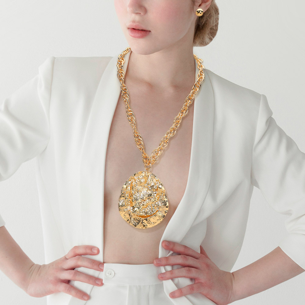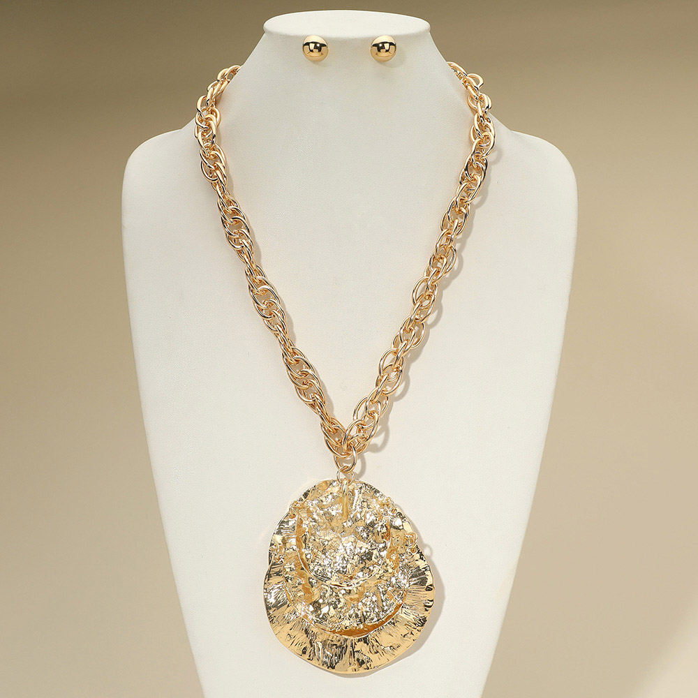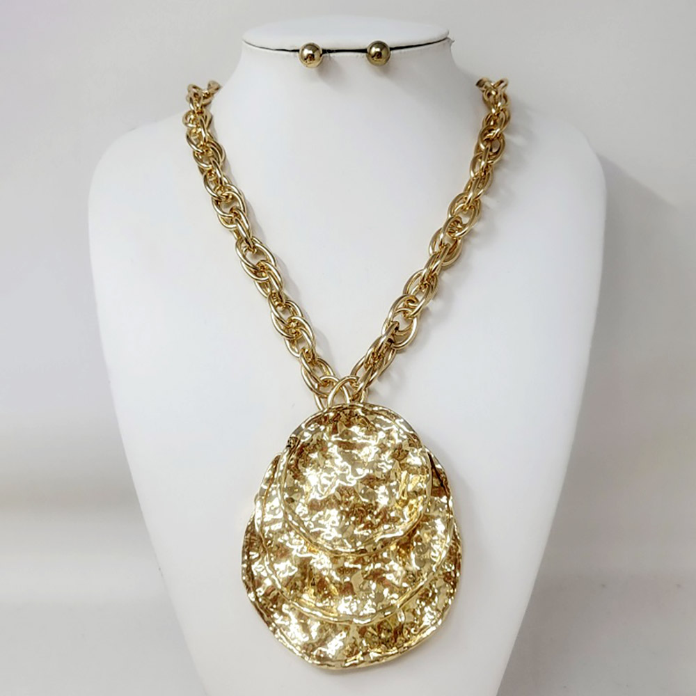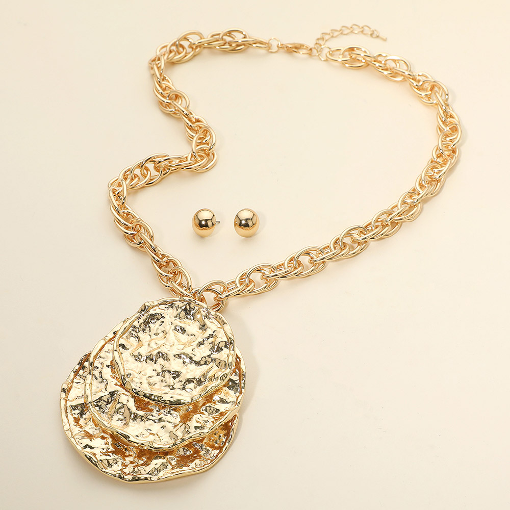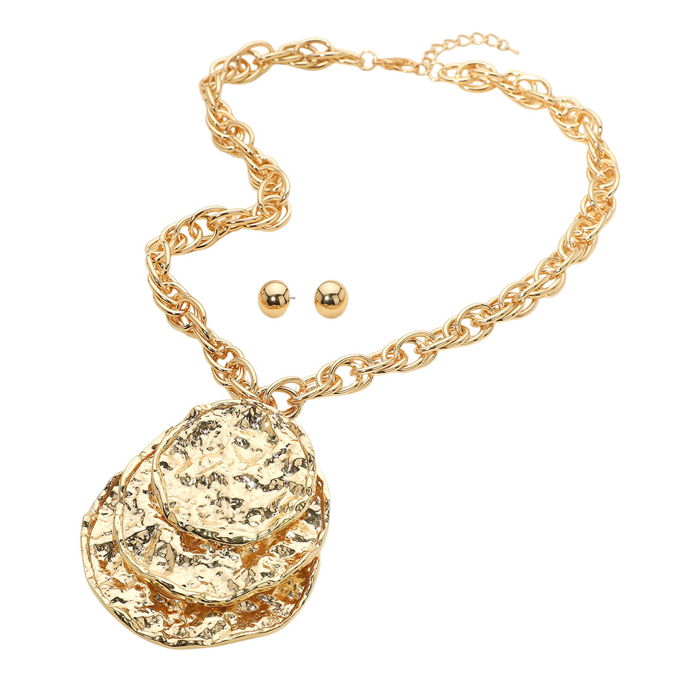 Details • Necklace Size : 24" + 2" L • Decor Size : 4" L • Earrings Size : 0.5" L • Dramatic statement necklace set featuring layered textured circular pendants on a chunky chain, paired with sleek round stud earrings. Perfect for evening wear, parties, and special occasions, this striking design adds elegance and flair to any outfit, making it an eye-catching accessory choice. • Lead and Nickel Compliant