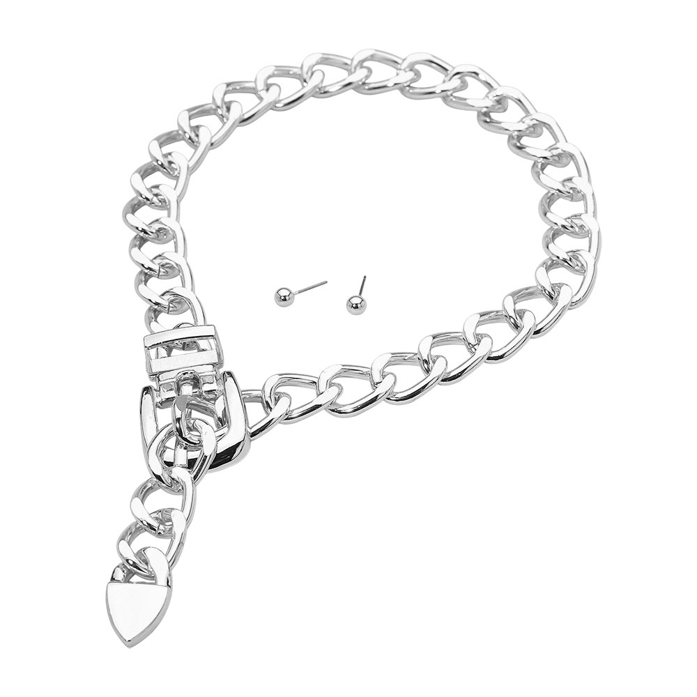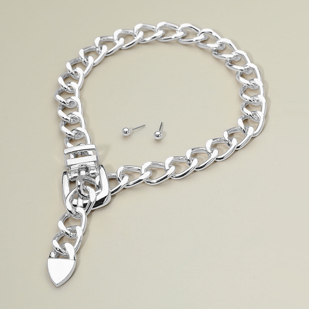 • Bold chunky chain necklace paired with simple stud earrings for a sleek and modern look. Designed to add edge to any outfit, this coordinated set brings a touch of contemporary style, making it a versatile accessory for casual and statement fashion.