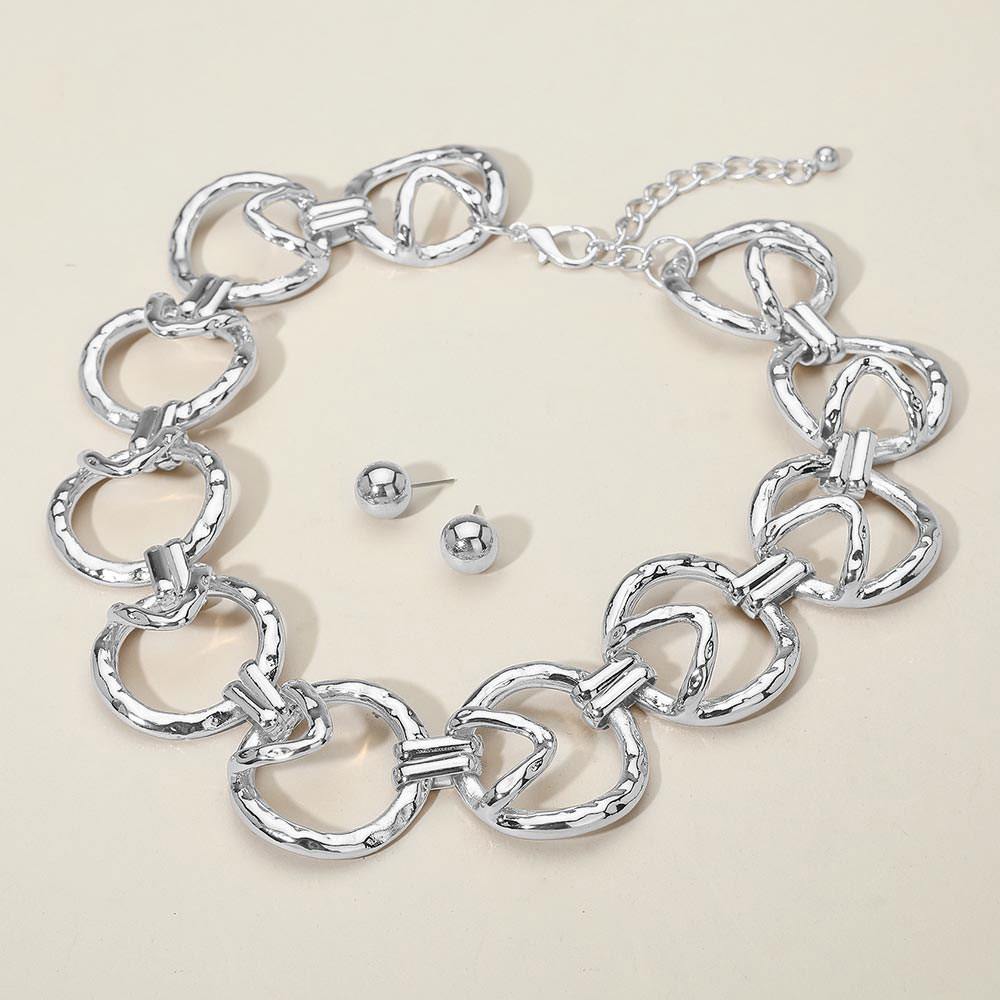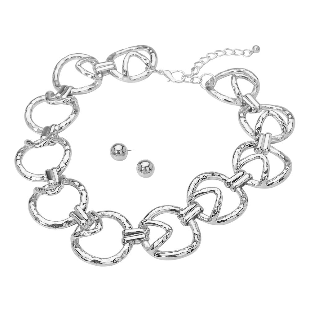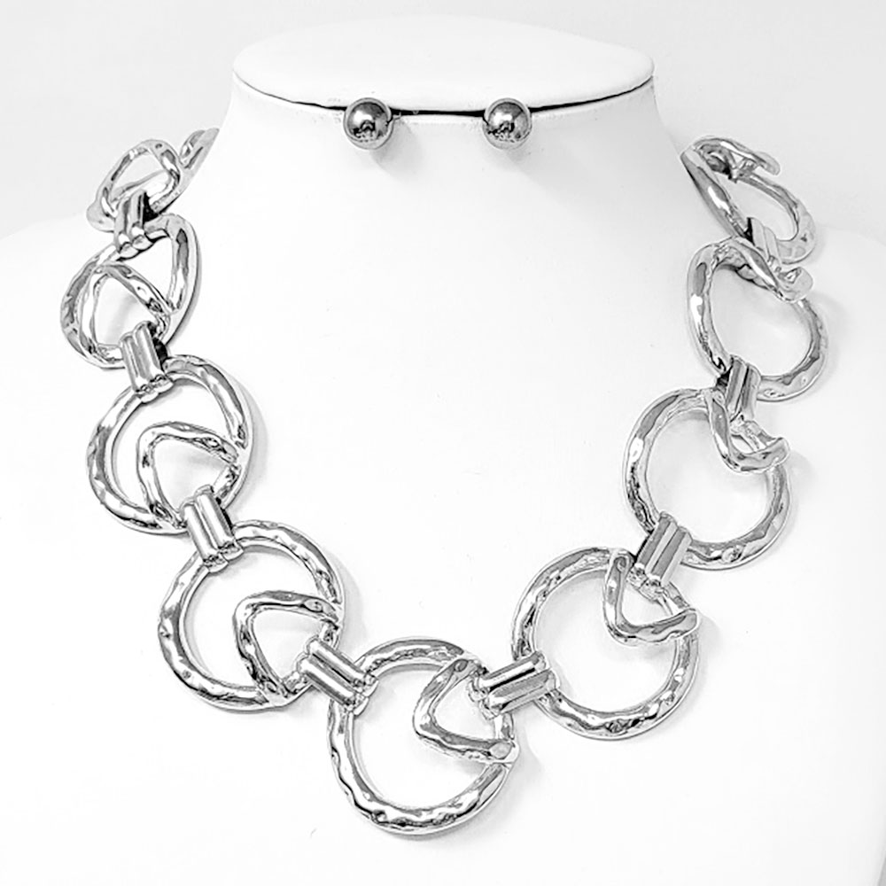 • Bold statement jewelry set featuring a chunky hammered link necklace with matching stud earrings. Designed with interlocking circular links, this striking set adds texture and shine, perfect for elevating both casual and formal looks with confident, modern style.