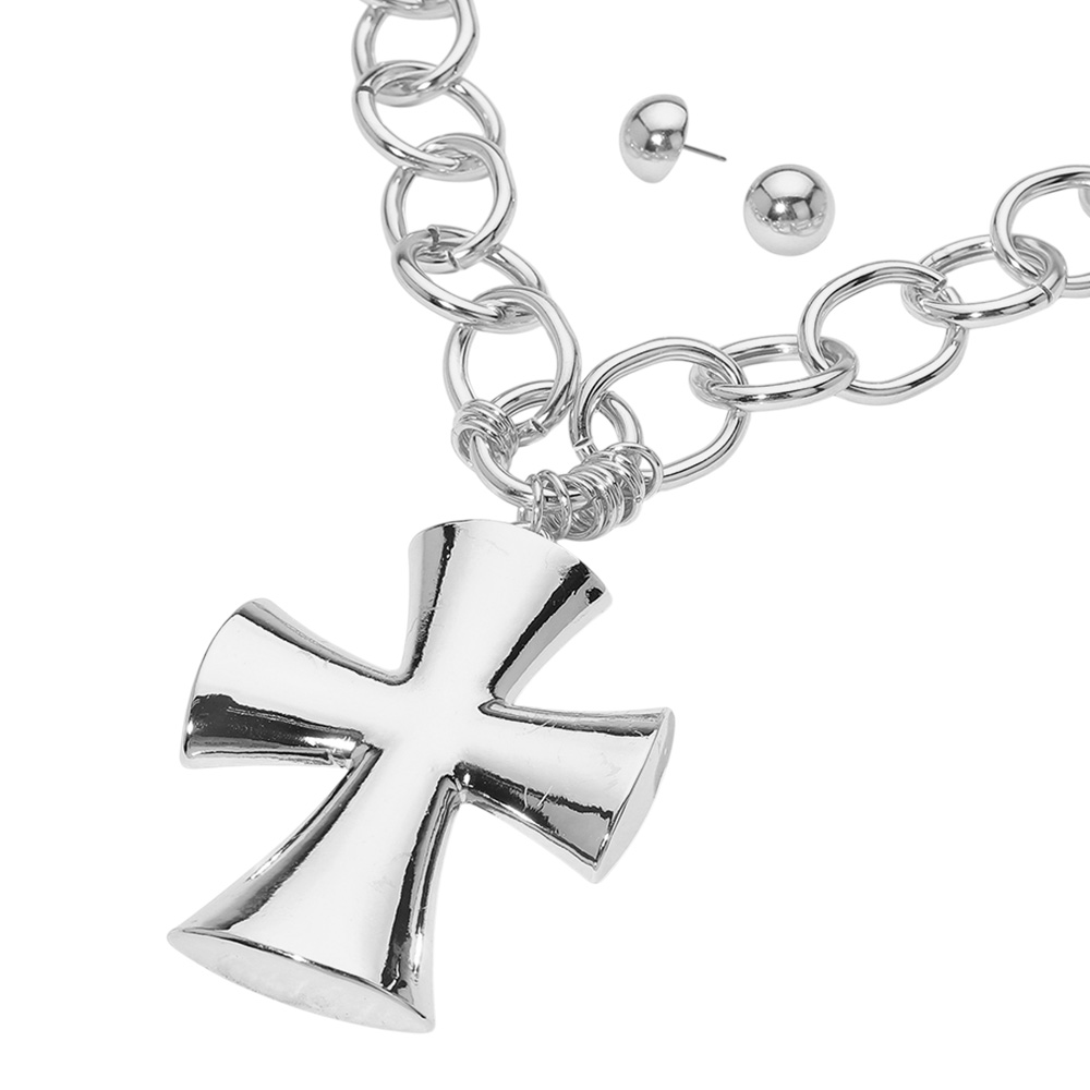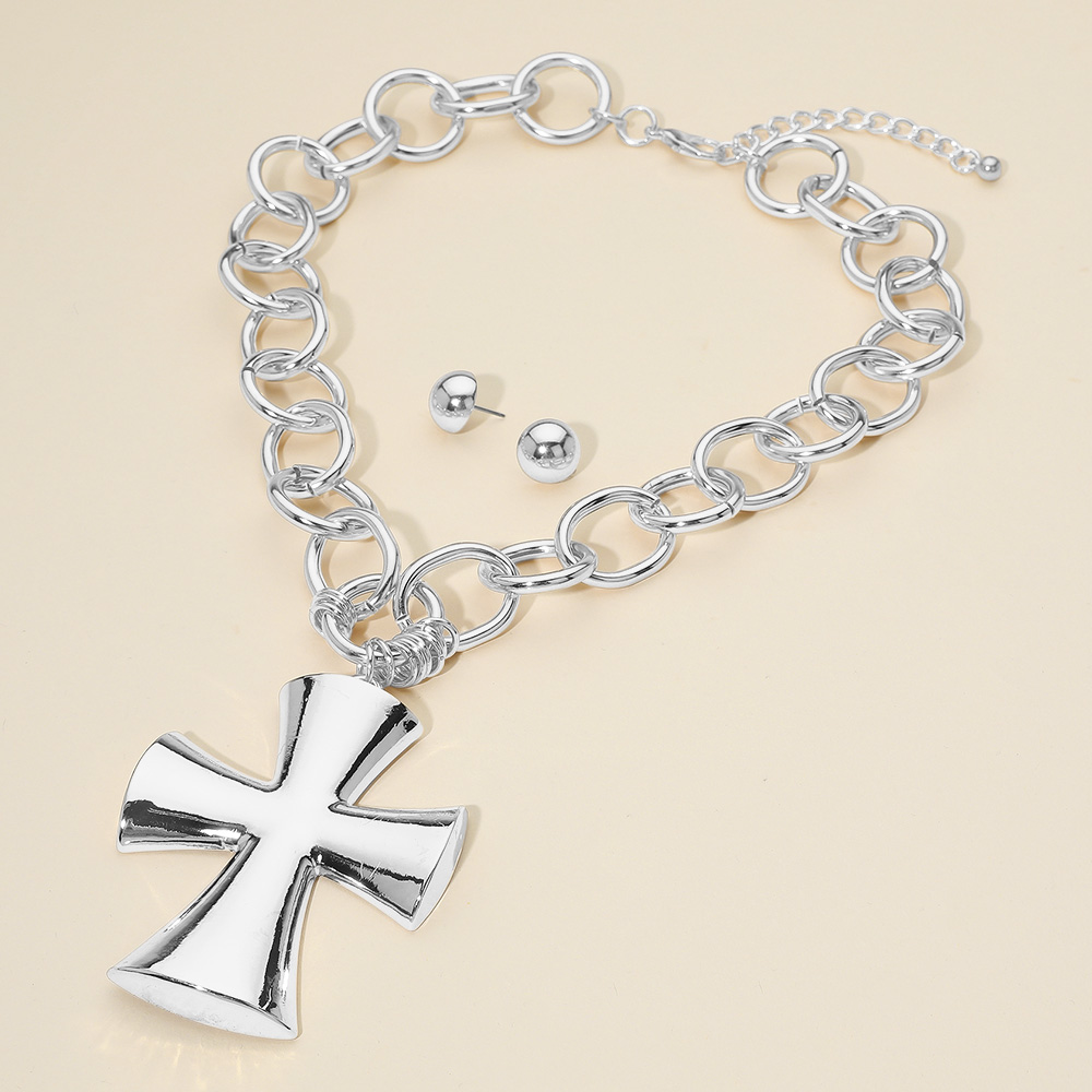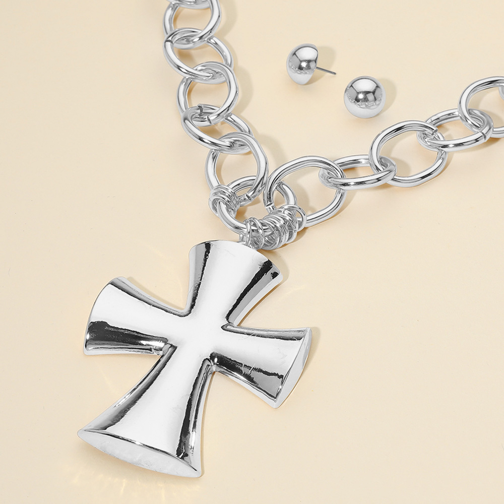 Details • Necklace Size : 20.5" + 3.25" L • Pendant Size : 2.5" X 3.25" • Earrings Size : 0.6" L • Make a statement with this striking cross pendant necklace paired with simple stud earrings. Featuring a chunky chain and bold pendant design, this set adds a touch of modern edge and elegance to any outfit, perfect for both casual and formal looks. • Lead and Nickel Compliant