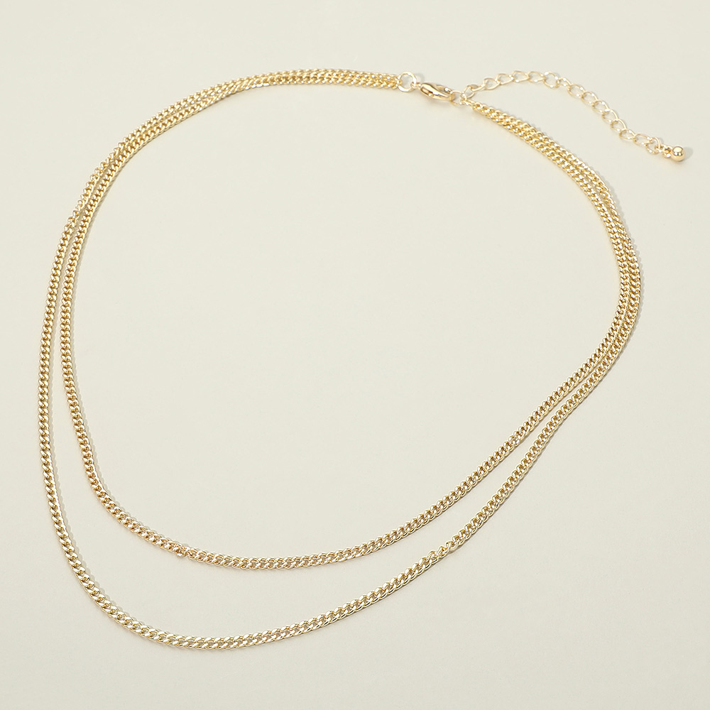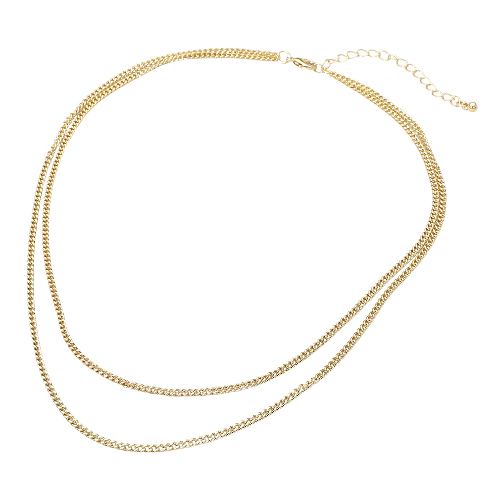 Details • Necklace Size : 18" + 3.25" L • Decor Size : 1" L • This double layer link chain necklace features a clean, modern silhouette designed for effortless layering and everyday styling. A versatile staple for boutiques and wholesale jewelry collections, it pairs seamlessly with pendants or stands out on its own, offering timeless appeal for contemporary and classic looks. • Lead and Nickel Compliant • Gold Dipped
