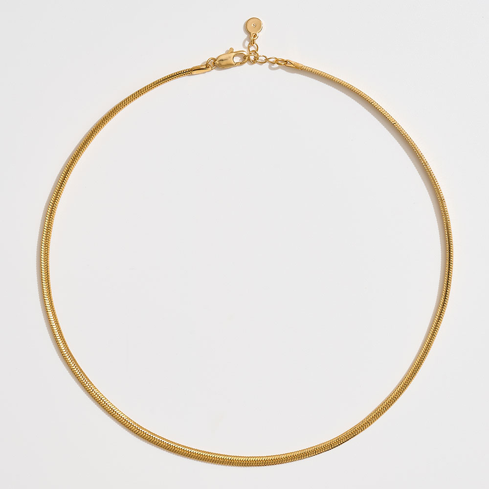 Details • Necklace Size : 18" + 1" L • Decor Size : 0.2" L • Elevate your look with this sleek snake chain necklace. Its smooth, flexible design drapes effortlessly along the neckline, offering a refined finish. Perfect for layering or as a standalone accent, this timeless piece adds modern sophistication to any outfit. • Brass • Gold Dipped • Hypoallergenic • Made In Korea