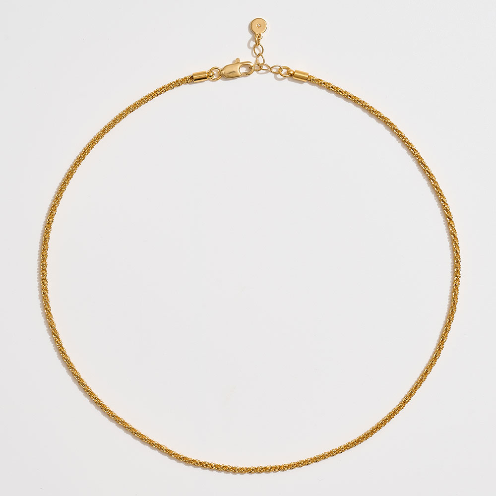 Details • Necklace Size : 18" + 1" L • Decor Size : 0.2" L • Elevate your style with this slim rope chain necklace, crafted with delicate twists that add refined texture and shine. Lightweight and versatile, it’s the perfect piece for layering or wearing alone, offering timeless sophistication for both casual and formal looks. • Brass • Gold Dipped • Hypoallergenic • Made In Korea