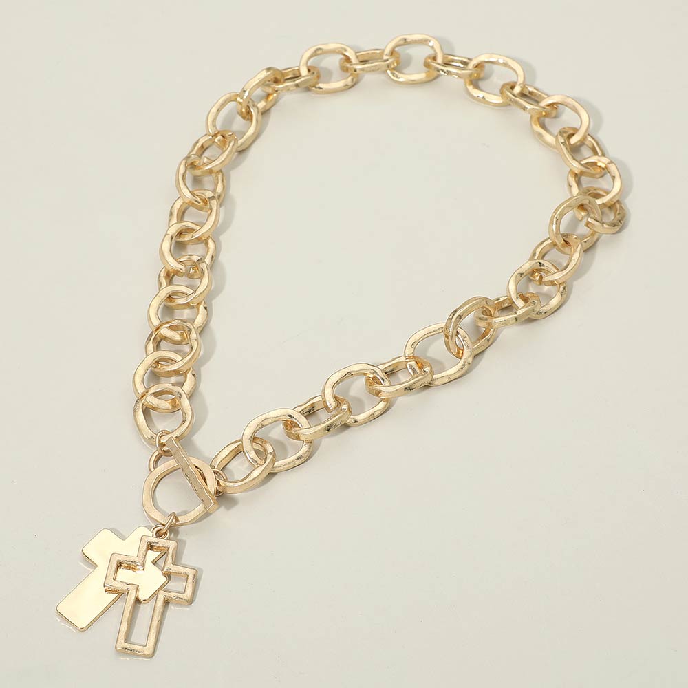 Hammered Layered Cross Pendant Chunky Chain Toggle Necklace Hammered Layered Cross Pendant Chunky Chain Toggle Necklace