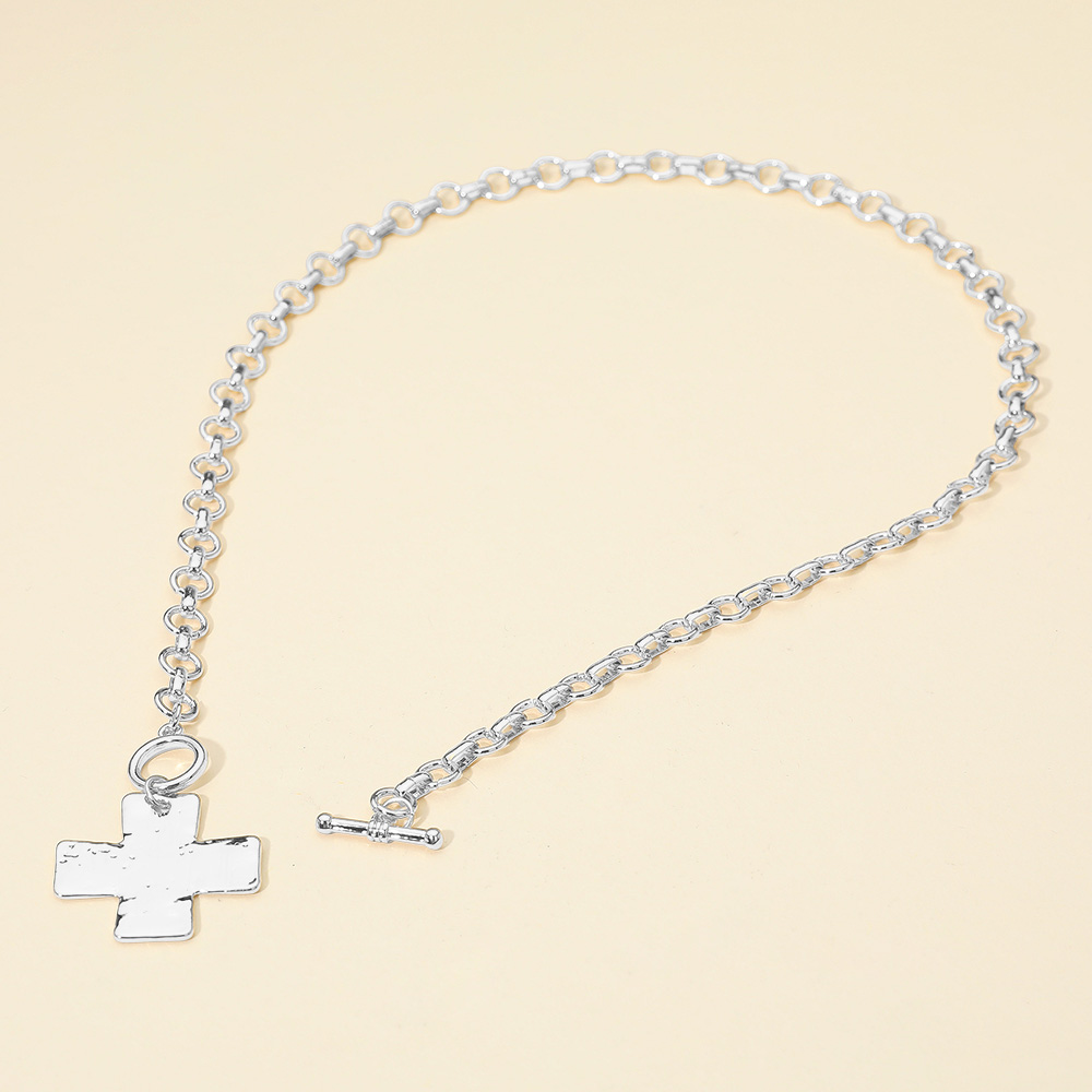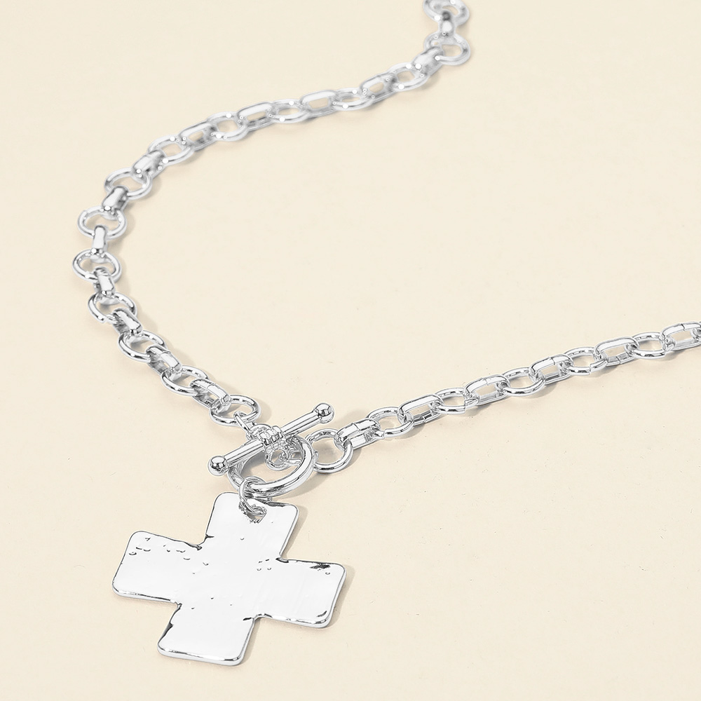 Hammered Metal Cross Pendant Chunky Chain Toggle Necklace