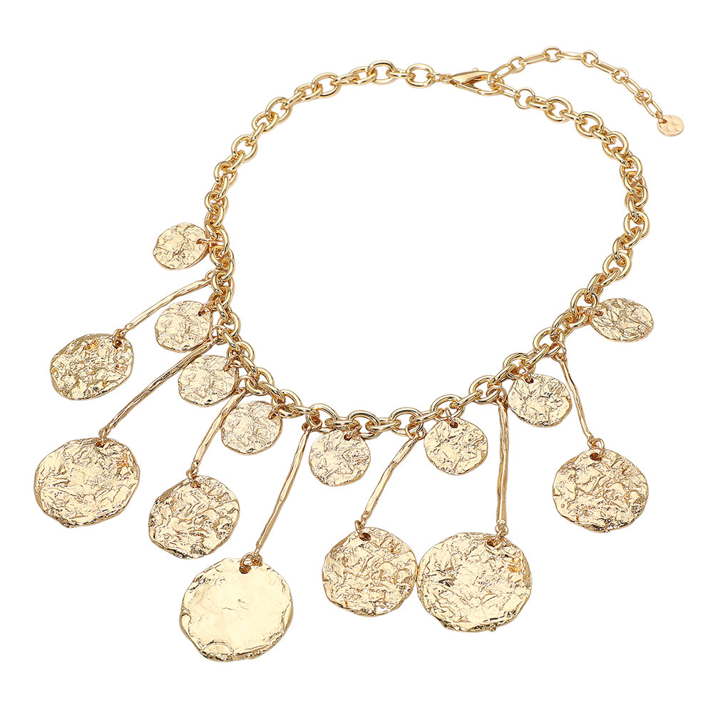 Details • Necklace Size : 17" + 3" L • Decor Size : 3.5" L • Elevate your look with this mixed coin dangle statement necklace featuring textured charms that sway gracefully with every movement. Its bold, eye-catching design brings artistic flair to any outfit, making it an ideal accessory for adding standout style to both casual and dressy ensembles. • Lead and Nickel Compliant