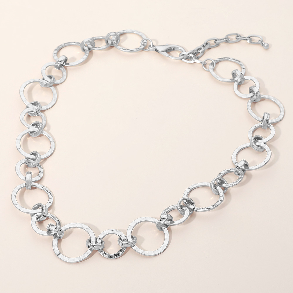 Details • Necklace Size : 18.5" + 3.25" L • Decor Size : 0.9" L • This hammered link statement necklace features bold circular links with an organic, textured finish for a modern yet timeless look. Designed to sit comfortably at the neckline, it adds depth and visual interest without overwhelming an outfit. An adjustable extender allows flexible styling, making it easy to wear alone as a statement or layered with other necklaces for everyday, office, or elevated casual looks. • Lead and Nickel Compliant